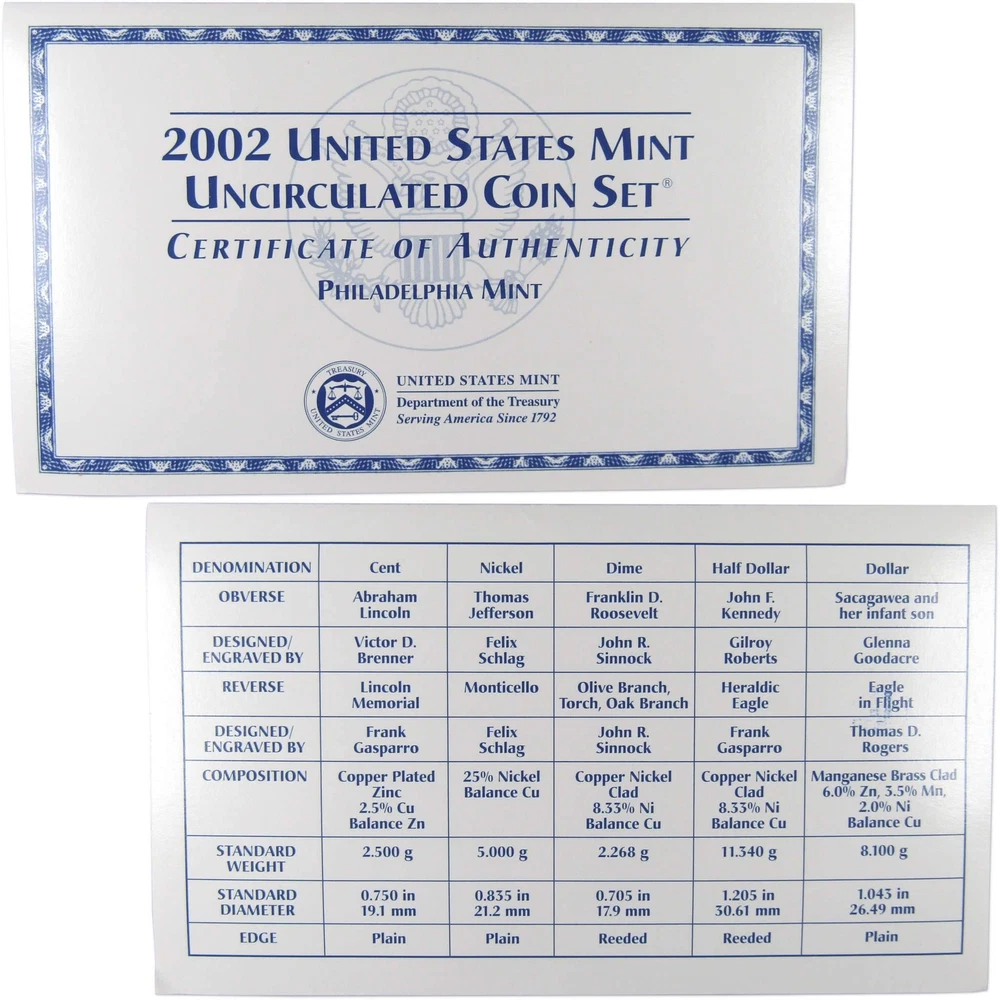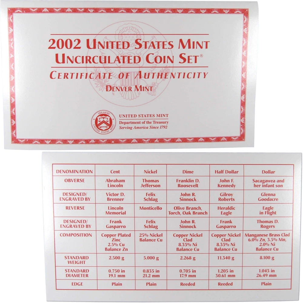 Home About Us Feedback View All Listings Contact Us Menu Home About Us Feedback View All Listings Contact Us 2002 Uncirculated Coin Set U.S Mint Government Packaging OGP COA This official 2002 U.S. Mint 20 coin Uncirculated Set contains Philadelphia and Denver Mint issues of the Sacagawea dollar, Kennedy half, Roosevelt dime, Jefferson nickel, Lincoln cent, and all five Statehood quarters. Comes with the original U.S. Mint packaging, including a certificate of authenticity. These sets were made in 2002 and are not brand new. The packaging may show signs of wear such as minor folds and scrapes. The images used for this listing are stock photos from our inventory. Your purchase is guaranteed to match the quality of the product shown. Profile Coins & Collectibles - More Coins for the Money! Coin Type U.S. Mint Uncirculated Coin Set Denomination 1C, 5C, 10C, 25C, 50C, $1 Date 2002 Mint Mark P, D Grade Uncirculated Shop by category Coins: US Half Dollars Quarters Small Cents Dollars Dimes Nickels Three Cents Large Cents Two Cents Paper Money: US Store Newsletter Add our store to your Favorites to receive our email newsletters about new items & special promotions. Sign Up Home About Us Feedback View All Listings Contact Us Copyright © 2019 Profile Coins & Collectibles. All rights reserved. eBay template Design by OCDesignsOnline