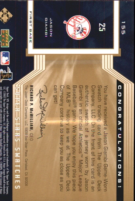 2002 (YANKEES) SPx SuperStar Swatch Gold #155 Jason Giambi /150 Front Back Sport: Baseball Set: 2002 SPx SuperStars Swatches Gold Year: 2002 Item#: 155 Player: Jason Giambi Team: New York Yankees Attributes: Memorabilia, Serial Numbered Brand: SPx Manufacturer: Upper Deck Co. Grading Company: Raw Grade SetType: Parallel Item Condition: Near Mint/Mint 2014 Beckett Collectibles, LLC. All Rights Reserved Powered by: Thank you for choosing Burbank Sportscards, the sports cards superstore. We offer a large selection of singles across all sports. Visit our ebay store to view all our items available. Our Shipping Policy We offer Free Standard Shipping to all Domestic customers. Options for Expedited shipping are also available at checkout. For our international customers, shipping is $9.99 for the first item, and $0.25 for each additional item. Note to all customers: To qualify for combines shipping, we ask our customers to add items into the shopping cart. Please note, we do not combine orders that are placed separately. Our Service: Generally, our turnaround is super quick as we process and send out orders same day payment is received. Stock Availability: We do our best to ensure all items are in stock; however, in case of the rare stock out, the customer will have the option for a replacement card, or we will process a refund so the order is not held up. Our Images: Many of our images are stock photos from Beckett archives. They are a representation of the actual card you would receive. If you have any questions regarding the item you're interested in, please feel free to ask (serial numbers and relic pieces may vary) Moreover, in a case of a wrong or defective photo, please notify us, so we can adjust it. Other FAQ's: -When buying multiple cards, do you top load each item? No; however, we do try to insure all items are shipped securely. If you wish to have all of your cards top loaded it is a paid service and can be arranged. Please email for more details. For other questions, please feel free to ask. Thank you.