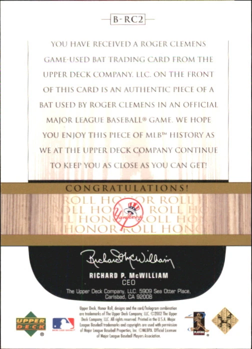 2002 (YANKEES) UD Honor Roll Game Bats #BRC2 Roger Clemens Motion /99 Front Back Sport: Baseball Set: 2002 Upper Deck Honor Roll Game Bats Year: 2002 Item#: BRC2 Player: Roger Clemens Team: New York Yankees Attributes: Memorabilia, Serial Numbered Brand: Upper Deck Honor Roll Manufacturer: Upper Deck Co. Grading Company: Raw Grade SetType: Insert Item Condition: Near Mint/Mint 2014 Beckett Collectibles, LLC. All Rights Reserved Powered by: Thank you for choosing Burbank Sportscards, the sports cards superstore. We offer a large selection of singles across all sports. Visit our ebay store to view all our items available. Our Shipping Policy We offer Free Standard Shipping to all Domestic customers. Options for Expedited shipping are also available at checkout. For our international customers, shipping is $9.99 for the first item, and $0.25 for each additional item. Note to all customers: To qualify for combines shipping, we ask our customers to add items into the shopping cart. Please note, we do not combine orders that are placed separately. Our Service: Generally, our turnaround is super quick as we process and send out orders same day payment is received. Stock Availability: We do our best to ensure all items are in stock; however, in case of the rare stock out, the customer will have the option for a replacement card, or we will process a refund so the order is not held up. Our Images: Many of our images are stock photos from Beckett archives. They are a representation of the actual card you would receive. If you have any questions regarding the item you're interested in, please feel free to ask (serial numbers and relic pieces may vary) Moreover, in a case of a wrong or defective photo, please notify us, so we can adjust it. Other FAQ's: -When buying multiple cards, do you top load each item? No; however, we do try to insure all items are shipped securely. If you wish to have all of your cards top loaded it is a paid service and can be arranged. Please email for more details. For other questions, please feel free to ask. Thank you.
