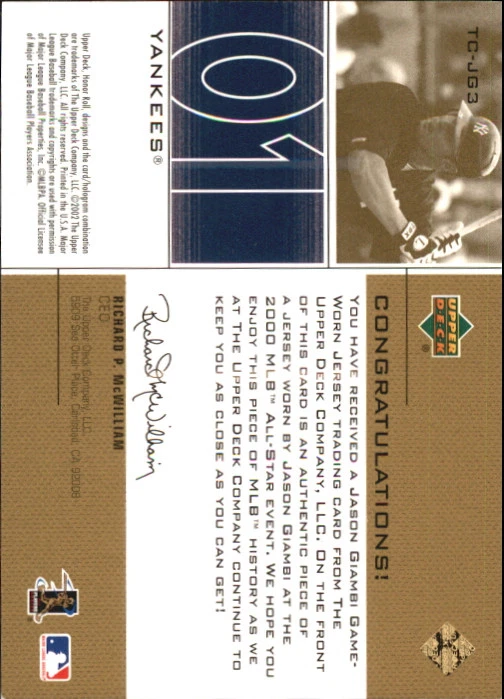 2002 (YANKEES) UD Honor Roll Time Capsule Game Jsy Gold #TCJG3 Jason Giambi 01 Front Back Sport: Baseball Set: 2002 Upper Deck Honor Roll Time Capsule Game Jersey Gold Year: 2002 Item#: TCJG3 Player: Jason Giambi Team: New York Yankees Attributes: Memorabilia, Serial Numbered Brand: Upper Deck Honor Roll Manufacturer: Upper Deck Co. Grading Company: Raw Grade SetType: Parallel Insert Item Condition: Near Mint/Mint 2014 Beckett Collectibles, LLC. All Rights Reserved Powered by: Thank you for choosing Burbank Sportscards, the sports cards superstore. We offer a large selection of singles across all sports. Visit our ebay store to view all our items available. Our Shipping Policy We offer Free Standard Shipping to all Domestic customers. Options for Expedited shipping are also available at checkout. For our international customers, shipping is $9.99 for the first item, and $0.25 for each additional item. Note to all customers: To qualify for combines shipping, we ask our customers to add items into the shopping cart. Please note, we do not combine orders that are placed separately. Our Service: Generally, our turnaround is super quick as we process and send out orders same day payment is received. Stock Availability: We do our best to ensure all items are in stock; however, in case of the rare stock out, the customer will have the option for a replacement card, or we will process a refund so the order is not held up. Our Images: Many of our images are stock photos from Beckett archives. They are a representation of the actual card you would receive. If you have any questions regarding the item you're interested in, please feel free to ask (serial numbers and relic pieces may vary) Moreover, in a case of a wrong or defective photo, please notify us, so we can adjust it. Other FAQ's: -When buying multiple cards, do you top load each item? No; however, we do try to insure all items are shipped securely. If you wish to have all of your cards top loaded it is a paid service and can be arranged. Please email for more details. For other questions, please feel free to ask. Thank you.