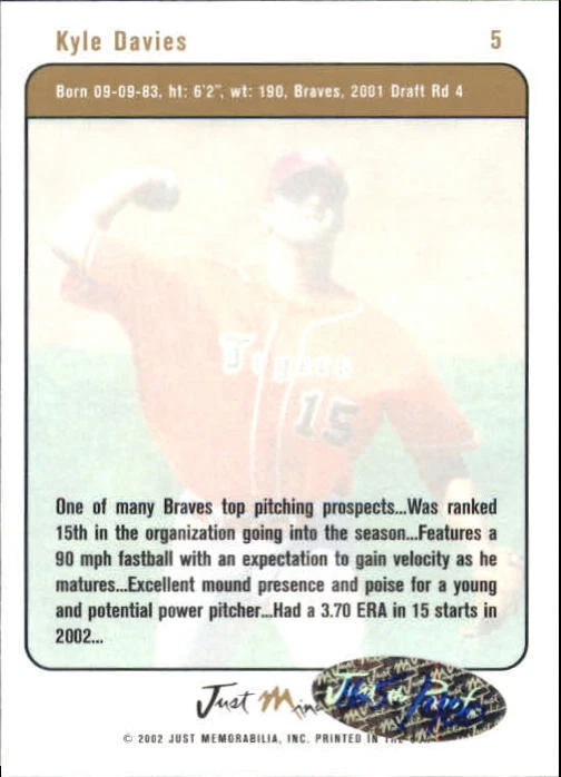 2002-03 Justifiable Autographs #5 Kyle Davies /400 Front Back Sport: Baseball Set: 2002-03 Justifiable Autographs Year: 2002 Item#: 5 Player: Kyle Davies Attributes: Autograph, Serial Numbered Brand: Justifiable Manufacturer: Just Grading Company: Raw Grade SetType: Insert Item Condition: Near Mint/Mint 2014 Beckett Collectibles, LLC. All Rights Reserved Powered by: Thank you for choosing Burbank Sportscards, the sports cards superstore. We offer a large selection of singles across all sports. Visit our ebay store to view all our items available. Our Shipping Policy We offer Free Standard Shipping to all Domestic customers. Options for Expedited shipping are also available at checkout. For our international customers, shipping is $9.99 for the first item, and $0.25 for each additional item. Note to all customers: To qualify for combines shipping, we ask our customers to add items into the shopping cart. Please note, we do not combine orders that are placed separately. Our Service: Generally, our turnaround is super quick as we process and send out orders same day payment is received. Stock Availability: We do our best to ensure all items are in stock; however, in case of the rare stock out, the customer will have the option for a replacement card, or we will process a refund so the order is not held up. Our Images: Many of our images are stock photos from Beckett archives. They are a representation of the actual card you would receive. If you have any questions regarding the item you're interested in, please feel free to ask (serial numbers and relic pieces may vary) Moreover, in a case of a wrong or defective photo, please notify us, so we can adjust it. Other FAQ's: -When buying multiple cards, do you top load each item? No; however, we do try to insure all items are shipped securely. If you wish to have all of your cards top loaded it is a paid service and can be arranged. Please email for more details. For other questions, please feel free to ask. Thank you.