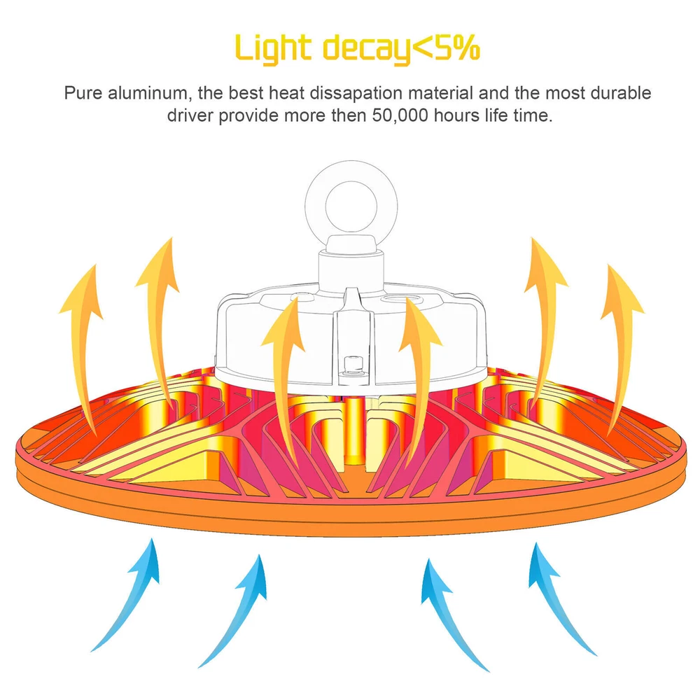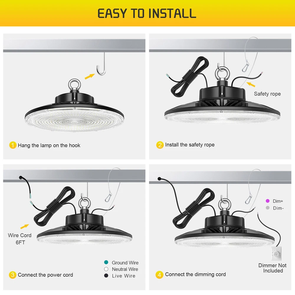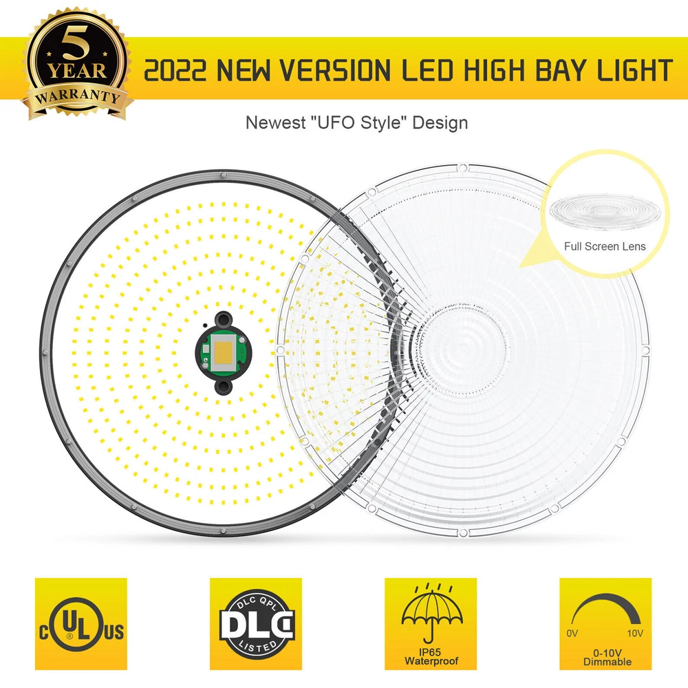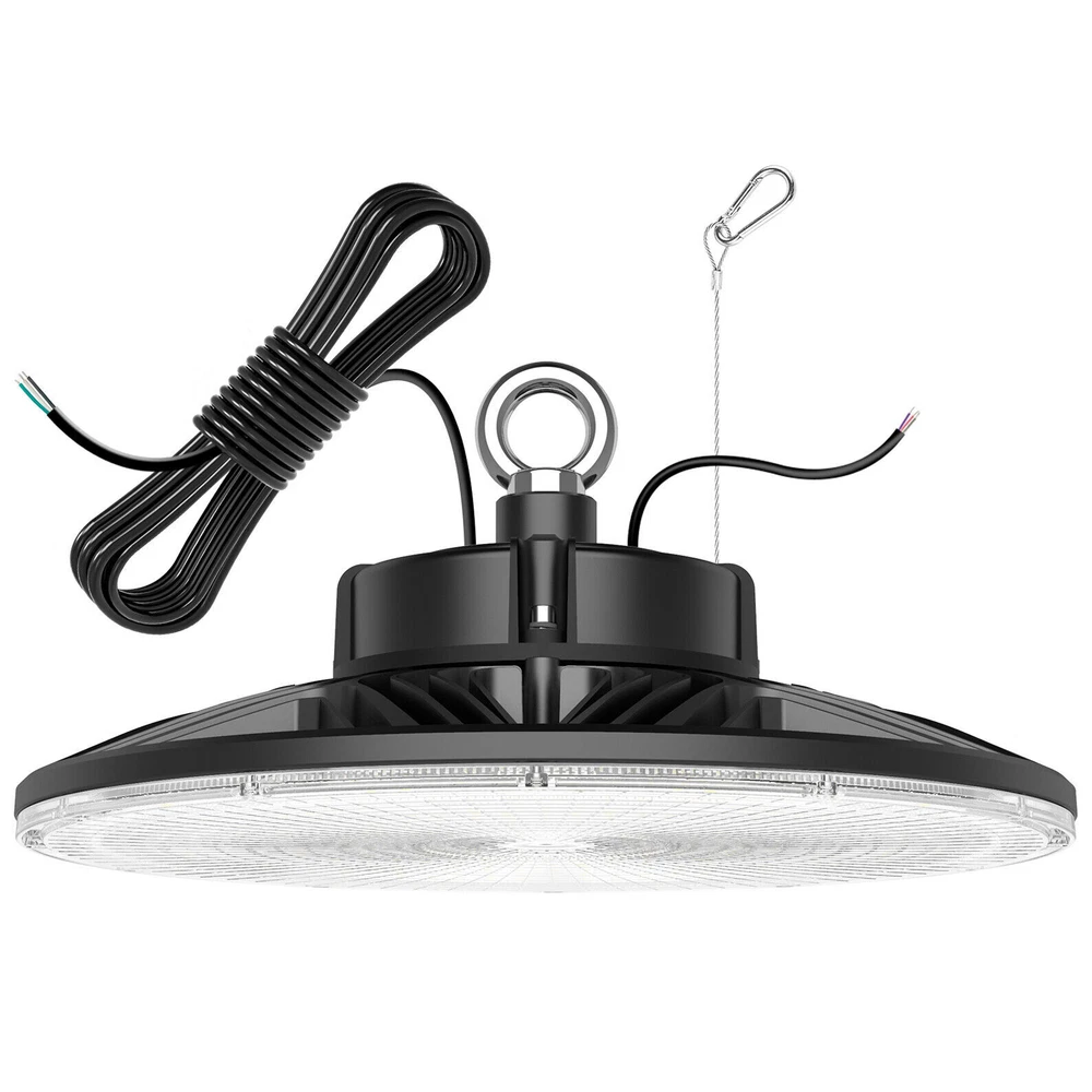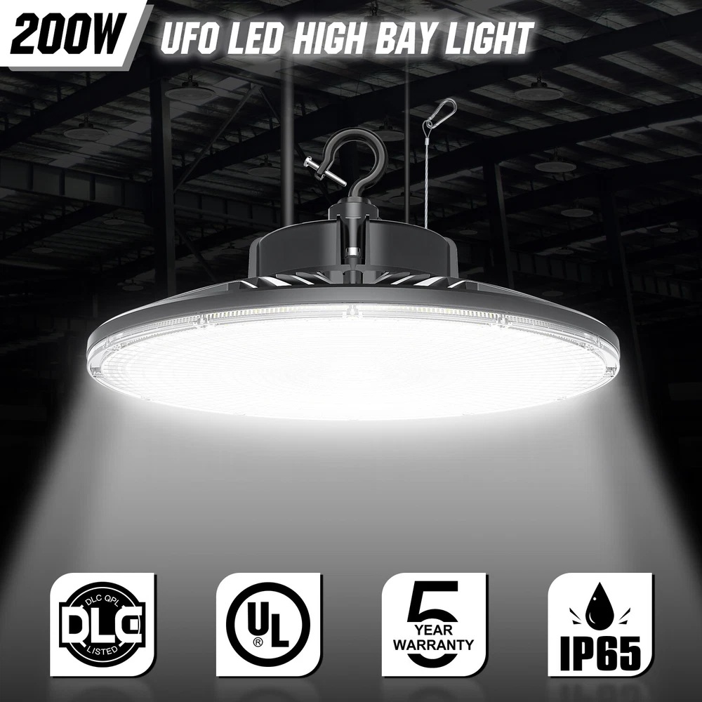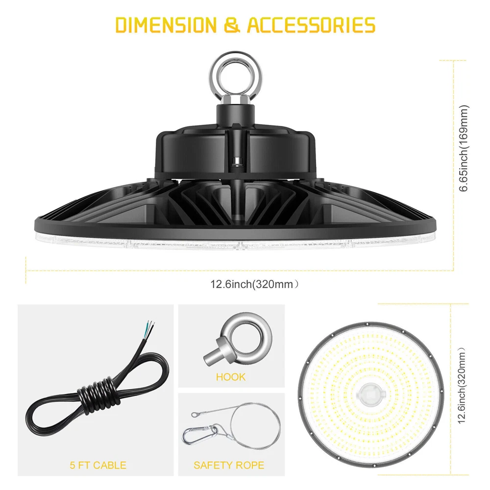 Product Description 200W LED High Bay Light Fixture 5000K Warehouse Garage Workshop 14~22Ft Ceiling 【2022 New Design: Thinner but Larger】Self-design UFO LED high bay light with unique feature of Ultra-thin and border-less design increases luminous area and Φ12.6in improving the heat dissipation of the ufo lights. As the first up & down bay light, the back emission will add the luminous area and light up your ceiling, which will make a total difference of your house with a decorative effect. Fully release your hand and save repairing time when you doing some repairing work around the ceiling. 【Energy&Money Saving】UFO high bay light with 28000 LM (140Lm/W) is a good choice for you to replace 800W HID/HPS, fluorescent and lithonia lights, will help you cut your bill cost down at least 90%. The high bay light has an LED rated life of 50,000 Hours! Over 10 years! Not only will you save on energy but the longer life of LEDs will reduce maintenance costs too. which could be your best commercial light choice! 【Fast&Easy Installation】Have you ever been driven crazy by those complex installation? KUKUPPO is determined to make your installation easy and happy from now on. The package includes a strong hook, a safety cable and 5 foot power cord. Save you time and energy to work on other projects! Please refer to detailed installation steps of instruction. 【Widely Use】IP65 Waterproof for all conditions. You are able to dim this high bay shop light from 0-100% . And it is perfect for both indoor and outdoor use: warehouse, factory, garage, workshop, supermarket, basement, retail space, logistics center, exhibition hall. Better Service: We provide a 5-year warranty for our light. In the next 5 years, we are always ready to stand by you. Please feel free to contact us for any product issue or suggestions. For a bulk order, please send us email in advance to get a lower price Specification Total Power: 200W Power Factor: >90% Input Voltage: AC100-277V 50/60Hz LED Type:SMD3030 LED chips with 130-150Lm/W Luminous Flux(lm): 28000Lm(120W) Color Temperature: 5,000K PFC: >90% Housing Materials: Aluminum Dimmable: 0-10V Dimmable UFO LED High Bay light is the commercial product(2022 version)for indoor warehouse factory or any commercial space with a 12ft ceiling height of ft or more. and with a Correlated Color Temperature (CCT) of 5000K and lumen output 140Lm/w Lumens, this high bay light can get you much brightness than old 400-1,000 Watt HID lights while it would also save you up to 80% of energy on each fixture. The variable maintenance cost gets down to zero owing to its efficiency and performance. It also can be easily hook mounted on any surface. Full screen-largest luminious area Full screen promises the maximum luminous area of UFO bay light. While old versions must leave some area for dissipation, which is not able to fully realize its efficiency. Perfect heat dissipation Compared with old versions, our high bay lights increase 18.75% in diameter, its dissipation area increases accordingly, so it gets better dissipation than others and its life spam will be extended. About Us Payment Shipping Returns Contact Us SHENZHEN NUOGUAN TECHNOLOGY CO. LTD founded in 2010. We are high-technology comany specialized in manufacture Commercial and industrial LED light. Advanced production equipment and excellend R&D ability help us to combining service ,production sell together provide top-level products to our customers. 1. Payment is expected within 7 days of auction close. Or Unpaid Items will be forfeited per eBay . 2. Taxes may be applicable at checkout as states adopt new laws and regulations regarding sales tax collection. 1. We ONLY ship to USA . 2. Orders processed within 1-2 business day of payment verification. There’s no Delivery service or courier service on Saturdays, Sundays or Public Holidays. 3. We have 3 different warehouse in US,so due to stock status and time differences, we will choose to ship your item from our first available warehouse for fast delivery. 4. We offer Free Shipping within the Lower 48 states! All packages are sent via UPS or USPS.The delivery time for UPS Ground is typically 2-5 business days. We strive to ensure 100% satisfaction for each and every one of our customers. we offer a 30-day 100% money-back guarantee on all eBay orders. If your item isn't just as you wished, simply send it back to us and we'll refund or replace your item. Please note that all returns must be authorized by our Customer Service department. please contact us though message first if you have any problem. USA Warehouse. Fast shipping! We are appreciated your purchasing form our eBay store. Office Time: 9:30 - 18:30, Monday - Saturday (UTC+8) Please contact us with eBay Message. We will respond you within 24 hours on business day. About Us SHENZHEN NUOGUAN TECHNOLOGY CO. LTD founded in 2010. We are high-technology comany specialized in manufacture Commercial and industrial LED light. Advanced production equipment and excellend R&D ability help us to combining service ,production sell together provide top-level products to our customers. Payment 1. Payment is expected within 7 days of auction close. Or Unpaid Items will be forfeited per eBay . 2. Taxes may be applicable at checkout as states adopt new laws and regulations regarding sales tax collection. Shipping 1. We ONLY ship to USA . 2. Orders processed within 1-2 business day of payment verification. There’s no Delivery service or courier service on Saturdays, Sundays or Public Holidays. 3. We have 3 different warehouse in US,so due to stock status and time differences, we will choose to ship your item from our first available warehouse for fast delivery. 4. We offer Free Shipping within the Lower 48 states! All packages are sent via UPS or USPS.The delivery time for UPS Ground is typically 2-5 business days. Returns We strive to ensure 100% satisfaction for each and every one of our customers. we offer a 30-day 100% money-back gu