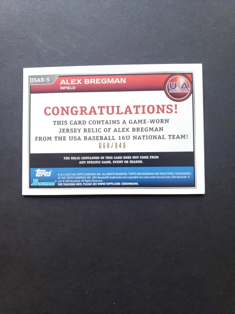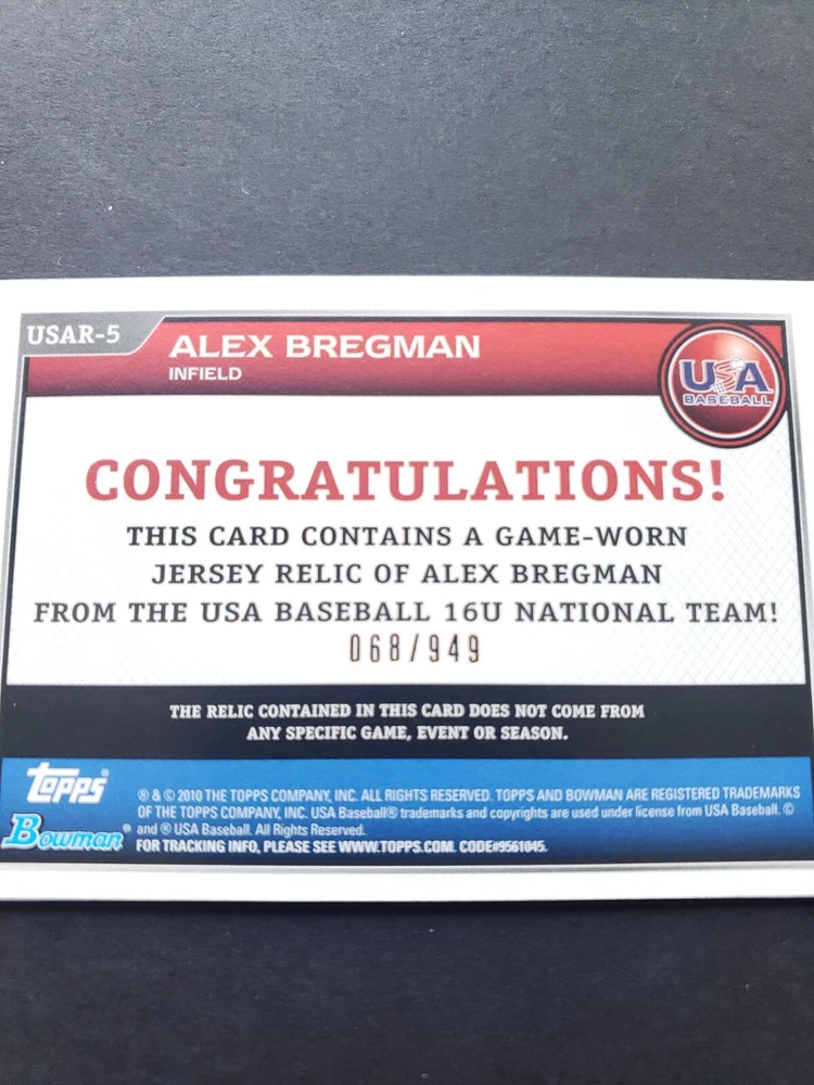 2010 Bowman Draft USA 16U National Team Jersey Relics /949 Alex Bregman #USAR-5.