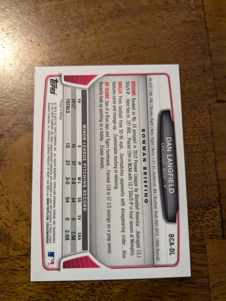 Prospects Autographs Dan Langfield #BCA-DL 2013 Bowman Chrome Shipping will be $4.00 for the first card within the United States, and free for every card after that. I do ship worldwide at a cost of $15.00, every additional card is free. Thanks for checking out my listing, and be sure to look at my other cards currently up for sale!