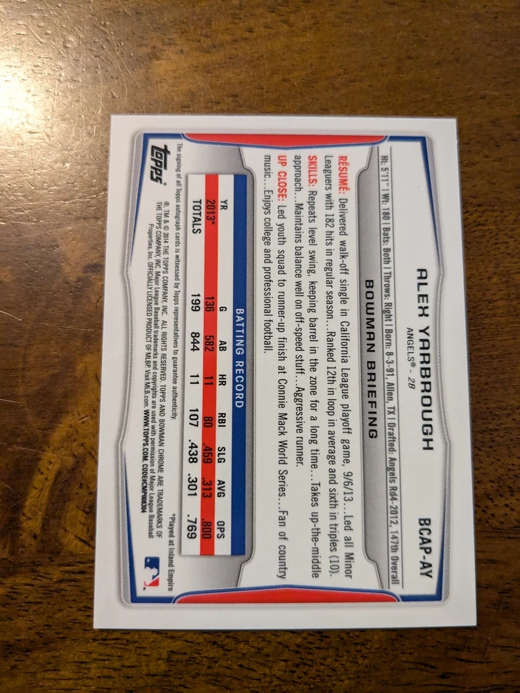 Chrome Prospect Autographs Alex Yarbrough #BCAP-AY 2014 Bowman Shipping will be $4.00 for the first card within the United States, and free for every card after that. I do ship worldwide at a cost of $15.00, every additional card is free. Thanks for checking out my listing, and be sure to look at my other cards currently up for sale!