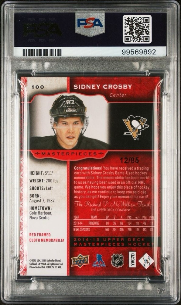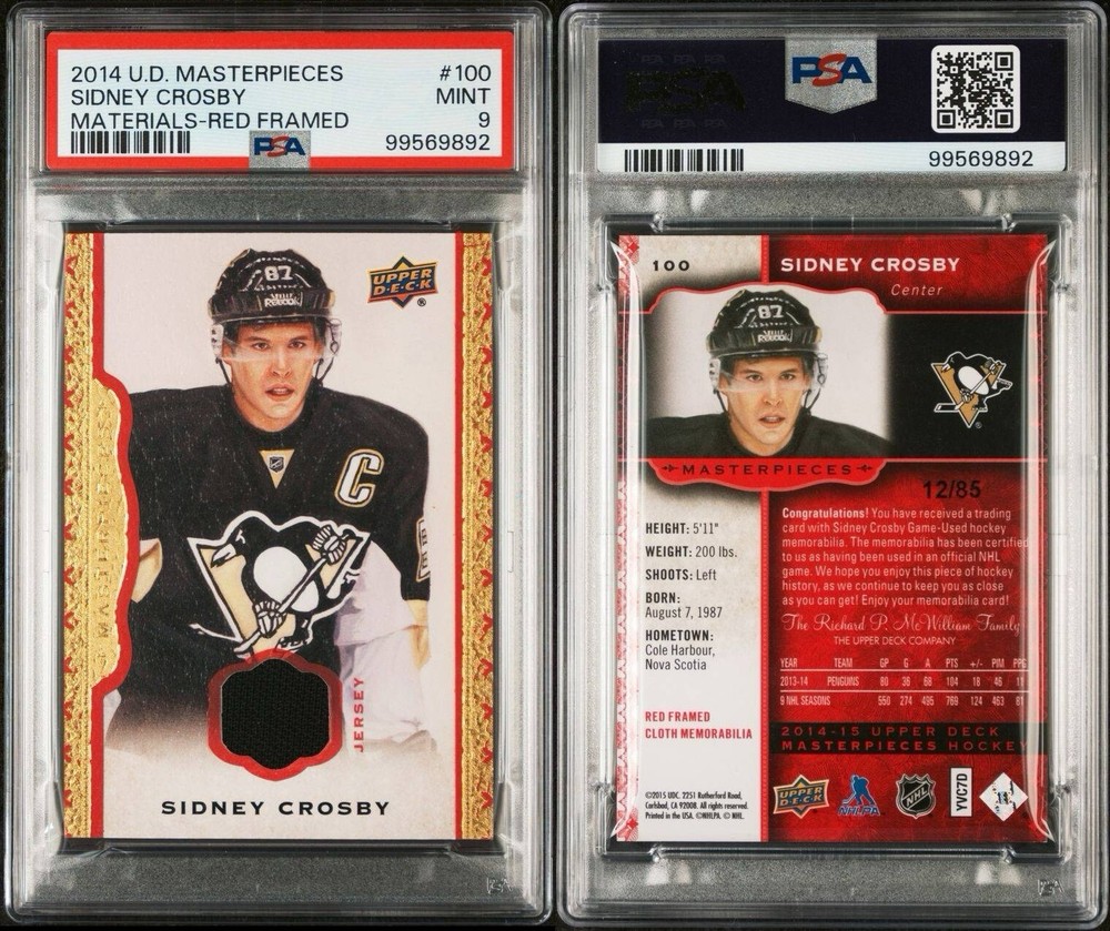 2014-15 U.D. Masterpieces Red Framed Memorabilia /85 Sidney Crosby PSA 9 Pop 1. None higher!