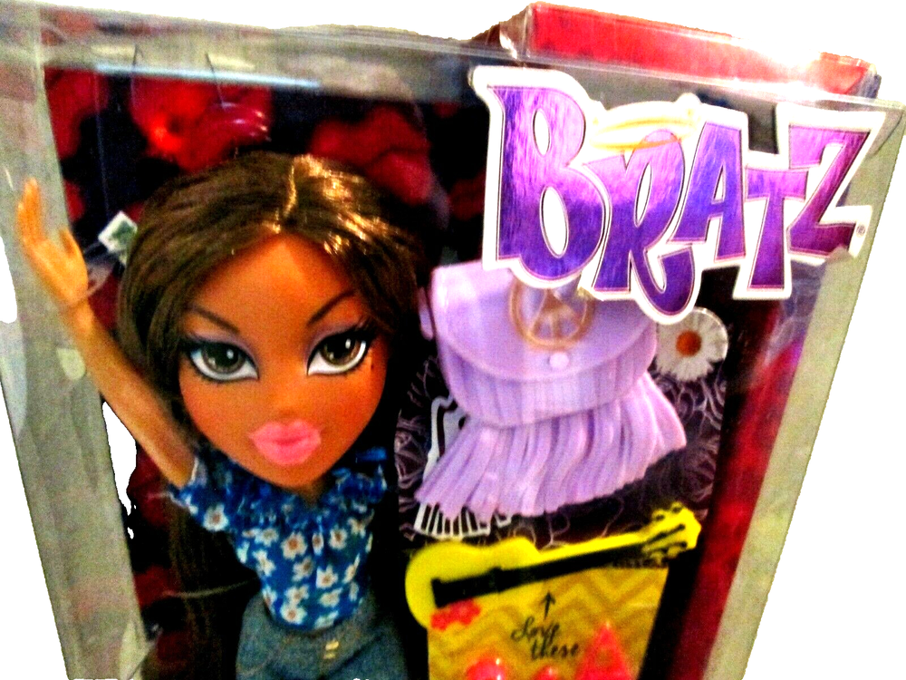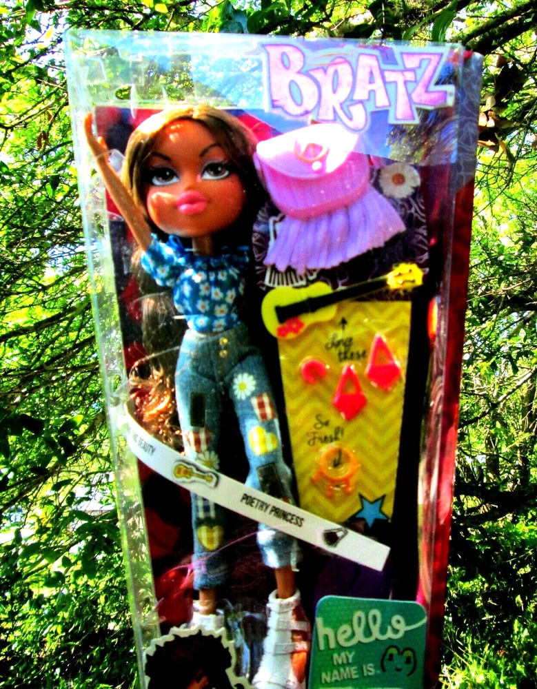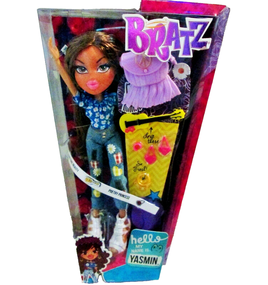 Great Price!!!! 2015 MGA Bratz "Hello My Name is Yasmin" Boho Chic Poetry Princess Doll New In Box. Yasmin is showing her Boho(Bohemian and Hippie) style by wearing a dark blue peasant style blouse with a white daisy print, a pair of blue jeans adorned with plaid and daisy flower patches and a pair of thick soled white strappy sandals. She comes with her own play guitar, a pair of bright pink earrings, a bright pink bracelet and a yellow necklace. She also has a cool lavender purse with bottom fringe. Love this look....such a cute doll!!! NOTES: 1) Box is in good condition but has extra tapes on the side applied by prior owner 2) Box has never been opened and doll and contents are in new condition. 3) USPS Priority and Ground Advantage shipping available for your choice at checkout. Thank you for looking!