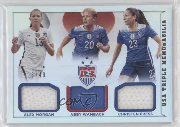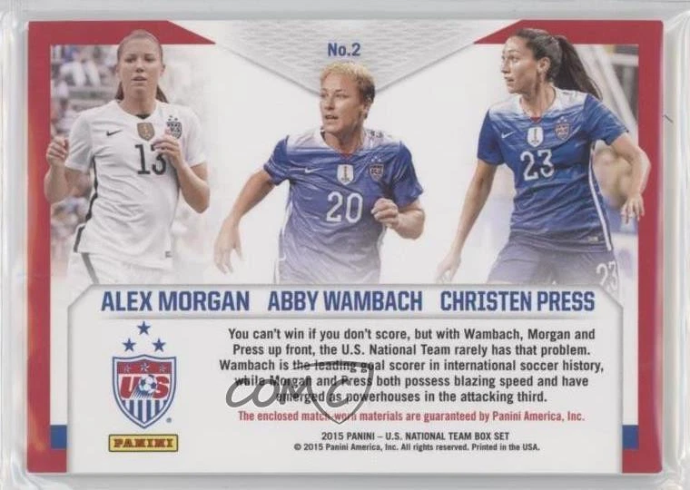 2015 Panini USA Soccer National Team - USA Triple Memorabilia #2 Abby Wambach, Christen Press, Alex Morgan Qty Made: 49 - Rookie - Soccer Card - Featuring the United States - Featuring Abby Wambach , Christen Press and Alex Morgan Search for more: 2015 Panini USA Soccer National Team Search for more: 2015 Panini USA Soccer National Team - USA Triple Memorabilia View all of our Listings Auctions Buy It Now About Us Located in the beautiful Pacific Northwest, COMC (Check Out My Cards) is the world's largest consignment service for trading card singles. More than 10,000 people have used our consignment service to list over 50 million trading cards. Find out how we can help you consign your items on eBay by contacting us through eBay messaging. COMC -- "The Safe & Easy Way to Buy & Sell" Representative Image - Select Specific Item above to see image of actual item Representative Image - Select Specific Item above to see image of actual item Raw Condition for Modern Cards Unless otherwise noted, raw modern cards are listed in Near Mint-Mint condition or better. A NM-MT card appears to be Mint at first glance, but upon closer inspection, may exhibit some of the following: minor print defects (e.g. roller marks, print line, dimple), minor scratches, slight edge wear, and slight corner wear. Centering is clearly visible in the images provided and does not factor into our condition assessment. Raw Condition for Vintage Cards Unless otherwise noted, raw vintage cards are listed in Excellent condition or better. An EX card may exhibit some of the following: minor rounding of corners, surface wear, print defects, light scratches, and slight edge wear/chipping. Centering is clearly visible in the images provided and does not factor into our condition assessment. Domestic Shipping Combined shipping for multiple items is available. To receive combined shipping, please ensure all desired items are in your eBay shopping cart before proceeding to checkout. eBay limits orders to 40 items per order. We automatically combine multiple orders placed on the same day. If you place multiple orders on the same day, please contact us to request a refund of applicable shipping costs. Signature confirmation may be required on invoices over $400. All cards are protected and shipped securely. International Shipping COMC offers eBay's International Shipping (EIS) for international orders under $2,500* (see country exceptions below). All duties and import fees are paid at checkout; in the rare event that there are additional import fees upon delivery, these are borne by the buyer. EIS packages route through a shipping hub in Erlanger, KY before shipping to their final destination. Please note that EIS does not allow for combined shipments. The shipping rates are determined by eBay and cannot be adjusted. *Maximum sale price exceptions: Colombia, Kuwait ($2,000); Taiwan ($1,539); Chile, Costa Rica, Guatemala, Honduras, Trinidad and Tobago ($1,000); Antigua and Barbuda, Aruba, Belize, Dominica, Grenada, Philippines, Saint Kitts and Nevis, Saint Lucia, Montserrat, Turks and Caicos Islands ($500); Dominican Republic, El Salvador ($200). Please request a shipping quote through eBay messaging for orders that exceed the maximum sale price supported by eBay's International Shipping. You will be responsible for all duties and import fees for international orders shipped outside the EIS. All cards are protected and shipped securely. Payment COMC does not accept offers on our cards through our eBay storefront. COMC utilizes eBay’s managed payments system. If you are experiencing difficulties making a payment, please contact eBay for assistance. Return Policy Returns are only accepted on the rare occasion the item is not as described. If you are making a return, please initiate the return process through eBay so a mailing label can be provided for you. Prior to listing, our expert team carefully assessed this item to represent it accurately. Please review the description and high-definition images prior to purchasing to ensure this item meets your satisfaction. We welcome you to contact us if you have further questions about this item. Trust and Integrity COMC carefully assesses each item consigned to us to prevent fraudulent items from entering the marketplace. If you believe an item offered on COMC may be fraudulent, please contact us with details so we can investigate the issue. Items we determine are outside our supported items policy may be removed. Last Modified: 2/18/2025 9:25:17 AM PDT