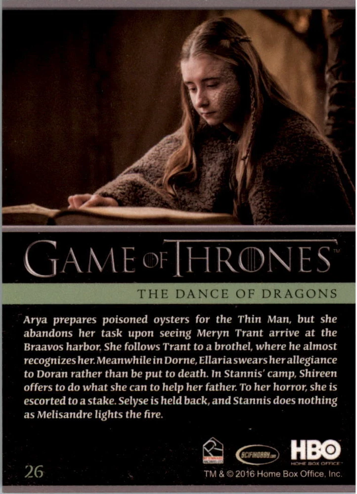 2016 Game of Thrones Sea. 5 Non-Sport Card #26 The Dance of Dragons Front Back Sport: Non-sports Set: 2016 Rittenhouse Game of Thrones Season Five Year: 2016 Item#: 26 Manufacturer: Rittenhouse Grading Company: Raw Grade SetType: Main Item Condition: Near Mint/Mint 2014 Beckett Collectibles, LLC. All Rights Reserved Powered by: Thank you for choosing Burbank Sportscards, the sports cards superstore. We offer a large selection of singles across all sports. Visit our ebay store to view all our items available. Our Shipping Policy We offer Free Standard Shipping to all Domestic customers. Options for Expedited shipping are also available at checkout. For our international customers, shipping is $9.99 for the first item, and $0.25 for each additional item. Note to all customers: To qualify for combines shipping, we ask our customers to add items into the shopping cart. Please note, we do not combine orders that are placed separately. Our Service: Generally, our turnaround is super quick as we process and send out orders same day payment is received. Stock Availability: We do our best to ensure all items are in stock; however, in case of the rare stock out, the customer will have the option for a replacement card, or we will process a refund so the order is not held up. Our Images: Many of our images are stock photos from Beckett archives. They are a representation of the actual card you would receive. If you have any questions regarding the item you're interested in, please feel free to ask (serial numbers and relic pieces may vary) Moreover, in a case of a wrong or defective photo, please notify us, so we can adjust it. Other FAQ's: -When buying multiple cards, do you top load each item? No; however, we do try to insure all items are shipped securely. If you wish to have all of your cards top loaded it is a paid service and can be arranged. Please email for more details. For other questions, please feel free to ask. Thank you.