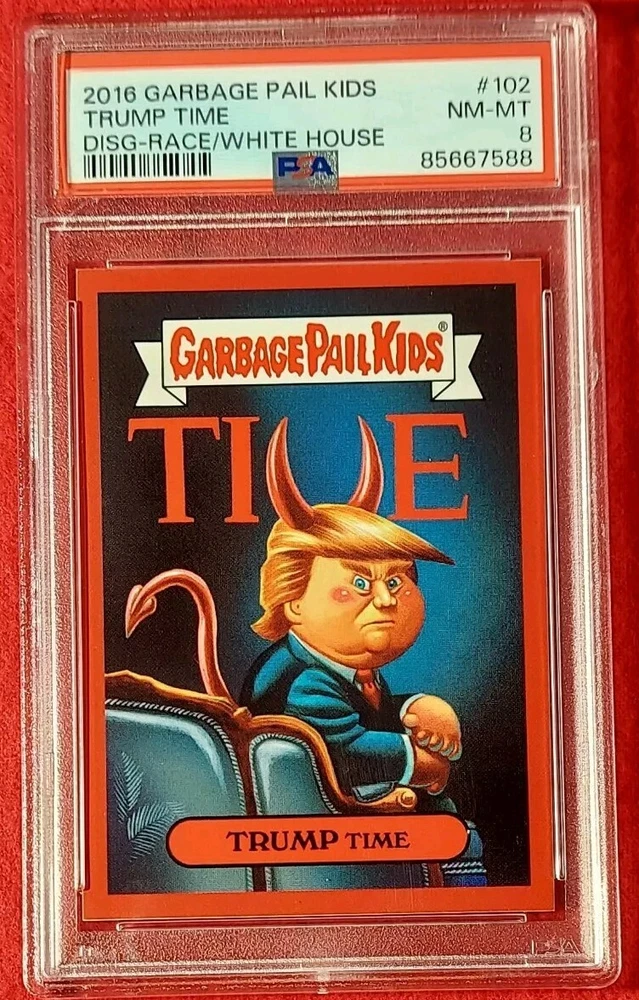 This limited edition Garbage Pail Kids Disg-Race to the White House trading card features Donald Trump and is a must-have for any collector. The art is a parody of Trump's Times Magazine cover. It is graded at a PSA 8. The card's unique design make it a valuable addition to any collection. This card is a rare find and is sure to impress any collector looking for a valuable addition to their collection. This is an amazing addition to any GPK fan or Trump fan's collection. Feel free to ask questions. Thanks for looking!