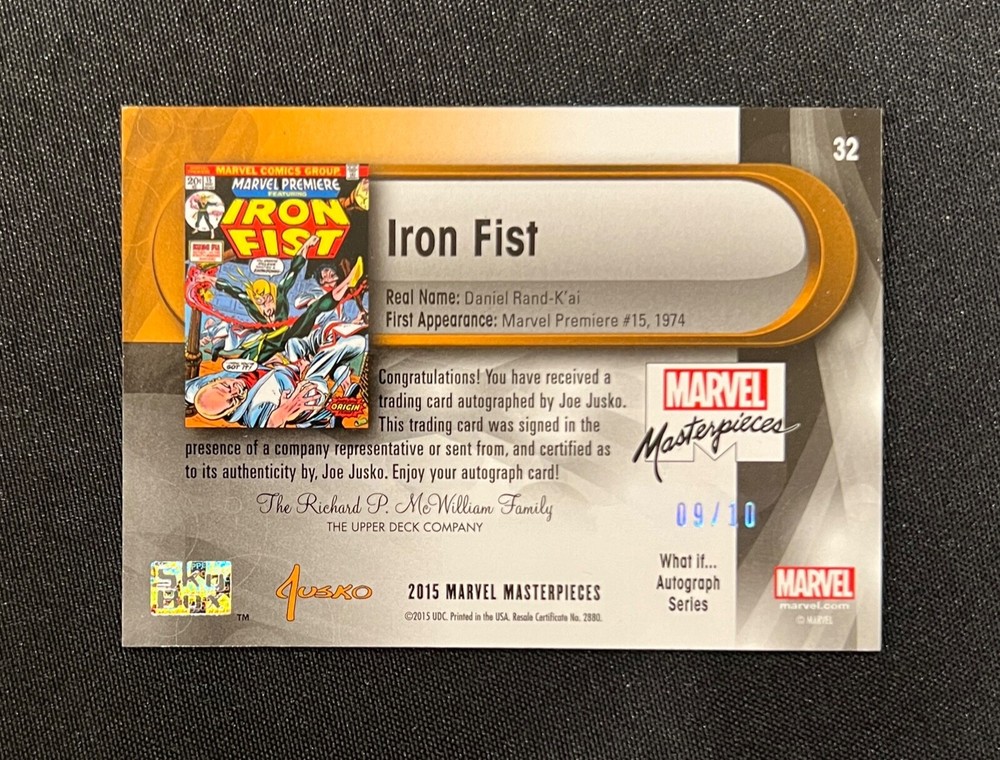 2016 MARVEL MASTERPIECES # 32 IRON FIST WHAT IF SILVER AUTOGRAPH CARD. CASE HIT /10 CARD IS IN GREAT (NM/M) CONDITION OR BETTER. 09/10 CARD IS SIGNED BY ARTIST JOE JUSKO AND CERTIFIED BY THE UPPER DECK COMPANY. ALL MY ITEMS COME FROM A SMOKE-FREE HOUSE. SHIPMENT WILL BE SENT IN 2 DAYS OF PAYMENT. I WILL SHIP THIS CARD IN THE GREATEST OF CARE. BUYERS OUTSIDE OF THE CONTINENTAL U.S. MAY HAVE TO PAY EXTRA FOR SHIPPING. I DO OFFER COMBINE SHIPPING RATES. SO PLEASE CHECK OUT MY OTHER ITEMS . FEEL FREE TO MESSAGE ME WITH ANY QUESTIONS. THANKS FOR LOOKING AND GOOD LUCK.