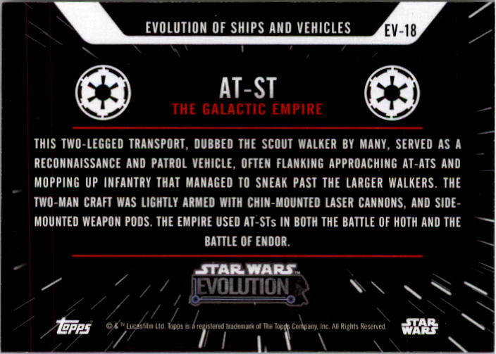 2016 Star Wars Evolution Evolution of Vehicles and Ships Card #EV18 AT-ST Front Back Sport: Non-sports Set: 2016 Topps Star Wars Evolution Evolution of Vehicles and Ships Year: 2016 Item#: EV18 Manufacturer: Topps Co. Grading Company: Raw Grade SetType: Insert Item Condition: Near Mint/Mint 2014 Beckett Collectibles, LLC. All Rights Reserved Powered by: Thank you for choosing Burbank Sportscards, the sports cards superstore. We offer a large selection of singles across all sports. Visit our ebay store to view all our items available. Our Shipping Policy We offer Free Standard Shipping to all Domestic customers. Options for Expedited shipping are also available at checkout. For our international customers, shipping is $9.99 for the first item, and $0.25 for each additional item. Note to all customers: To qualify for combines shipping, we ask our customers to add items into the shopping cart. Please note, we do not combine orders that are placed separately. Our Service: Generally, our turnaround is super quick as we process and send out orders same day payment is received. Stock Availability: We do our best to ensure all items are in stock; however, in case of the rare stock out, the customer will have the option for a replacement card, or we will process a refund so the order is not held up. Our Images: Many of our images are stock photos from Beckett archives. They are a representation of the actual card you would receive. If you have any questions regarding the item you're interested in, please feel free to ask (serial numbers and relic pieces may vary) Moreover, in a case of a wrong or defective photo, please notify us, so we can adjust it. Other FAQ's: -When buying multiple cards, do you top load each item? No; however, we do try to insure all items are shipped securely. If you wish to have all of your cards top loaded it is a paid service and can be arranged. Please email for more details. For other questions, please feel free to ask. Thank you.