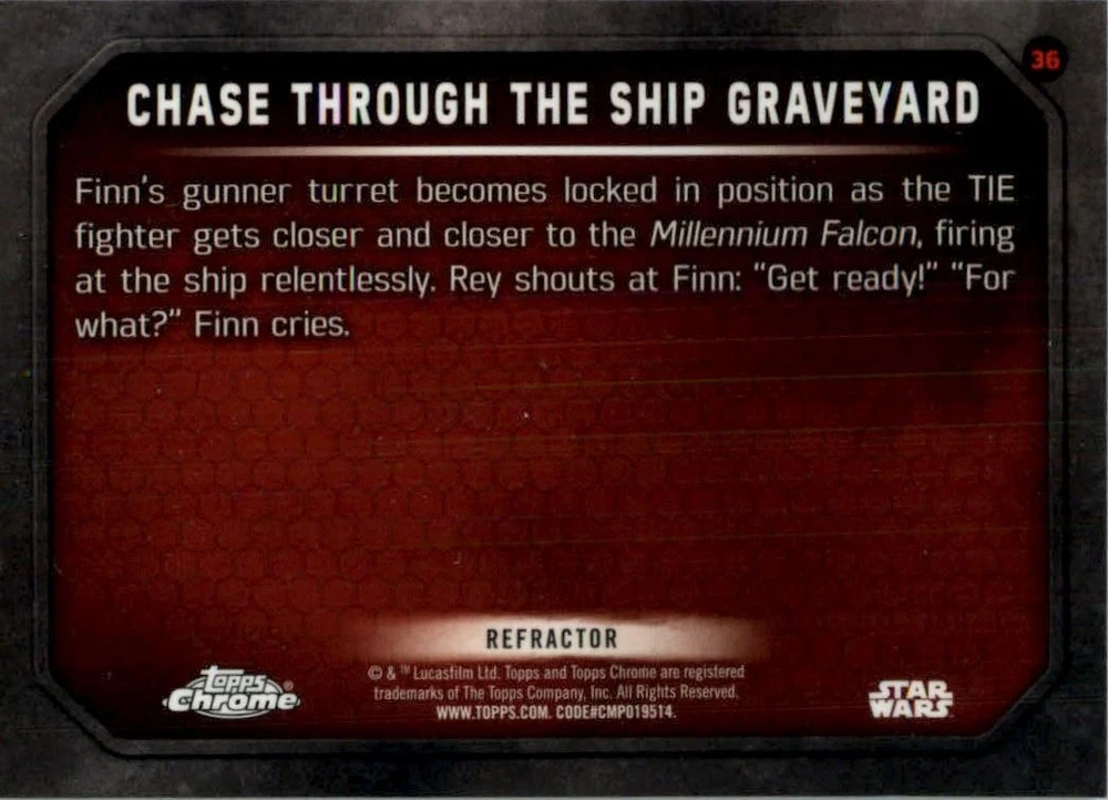 2016 Star Wars Force Awakens Chrome Wave Refractors #36 Ship Graveyard Front Back Sport: Non-sports Set: 2016 Topps Chrome Star Wars The Force Awakens Wave Refractors Year: 2016 Item#: 36 Manufacturer: Topps Co. Grading Company: Raw Grade SetType: Parallel Item Condition: Near Mint/Mint 2014 Beckett Collectibles, LLC. All Rights Reserved Powered by: Thank you for choosing Burbank Sportscards, the sports cards superstore. We offer a large selection of singles across all sports. Visit our ebay store to view all our items available. Our Shipping Policy We offer Free Standard Shipping to all Domestic customers. Options for Expedited shipping are also available at checkout. For our international customers, shipping is $9.99 for the first item, and $0.25 for each additional item. Note to all customers: To qualify for combines shipping, we ask our customers to add items into the shopping cart. Please note, we do not combine orders that are placed separately. Our Service: Generally, our turnaround is super quick as we process and send out orders same day payment is received. Stock Availability: We do our best to ensure all items are in stock; however, in case of the rare stock out, the customer will have the option for a replacement card, or we will process a refund so the order is not held up. Our Images: Many of our images are stock photos from Beckett archives. They are a representation of the actual card you would receive. If you have any questions regarding the item you're interested in, please feel free to ask (serial numbers and relic pieces may vary) Moreover, in a case of a wrong or defective photo, please notify us, so we can adjust it. Other FAQ's: -When buying multiple cards, do you top load each item? No; however, we do try to insure all items are shipped securely. If you wish to have all of your cards top loaded it is a paid service and can be arranged. Please email for more details. For other questions, please feel free to ask. Thank you.