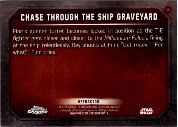 2016 Star Wars The Force Awakens Chrome Refractors #36 Chase the Ship Graveyard Front Back Sport: Non-sports Set: 2016 Topps Chrome Star Wars The Force Awakens Refractors Year: 2016 Item#: 36 Manufacturer: Topps Co. Grading Company: Raw Grade SetType: Parallel Item Condition: Near Mint/Mint 2014 Beckett Collectibles, LLC. All Rights Reserved Powered by: Thank you for choosing Burbank Sportscards, the sports cards superstore. We offer a large selection of singles across all sports. Visit our ebay store to view all our items available. Our Shipping Policy We offer Free Standard Shipping to all Domestic customers. Options for Expedited shipping are also available at checkout. For our international customers, shipping is $9.99 for the first item, and $0.25 for each additional item. Note to all customers: To qualify for combines shipping, we ask our customers to add items into the shopping cart. Please note, we do not combine orders that are placed separately. Our Service: Generally, our turnaround is super quick as we process and send out orders same day payment is received. Stock Availability: We do our best to ensure all items are in stock; however, in case of the rare stock out, the customer will have the option for a replacement card, or we will process a refund so the order is not held up. Our Images: Many of our images are stock photos from Beckett archives. They are a representation of the actual card you would receive. If you have any questions regarding the item you're interested in, please feel free to ask (serial numbers and relic pieces may vary) Moreover, in a case of a wrong or defective photo, please notify us, so we can adjust it. Other FAQ's: -When buying multiple cards, do you top load each item? No; however, we do try to insure all items are shipped securely. If you wish to have all of your cards top loaded it is a paid service and can be arranged. Please email for more details. For other questions, please feel free to ask. Thank you.