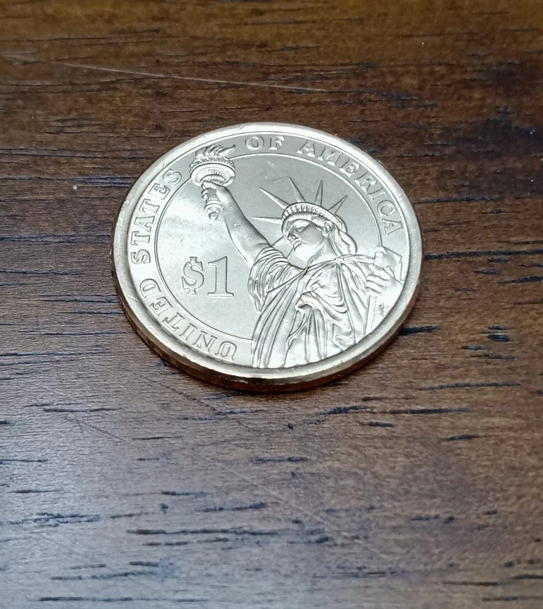 2016-P Presidential series dollar, of Ronald Reagan, the 40th President, Brilliant Uncirculated from a U.S. Mint roll, opened with a dollar displayed for sale here. This roll appears to be nearly full of brilliant uncirculated specimens, with no significant bag marks. This one is in Position B (the rim date and lettering are right side up when the obverse is positioned upwards). These 2007-to-present Presidential dollars are beautiful coins, with our lineage of U.S. presidents as historical figures featured, several in each year since, all with a depiction of the statue of Liberty on the reverse. For these presidents of later years within memory, some of us can tell you of the times when they served, like as represented by this coin how it was when "The Gipper" was president in the Big 1980s! One such coin straight from the Mint roll that we purchased can be yours, with free shipping. Elsewhere in the David MA Coins store, you can choose these as encapsulated coins from the same roll, if you prefer.