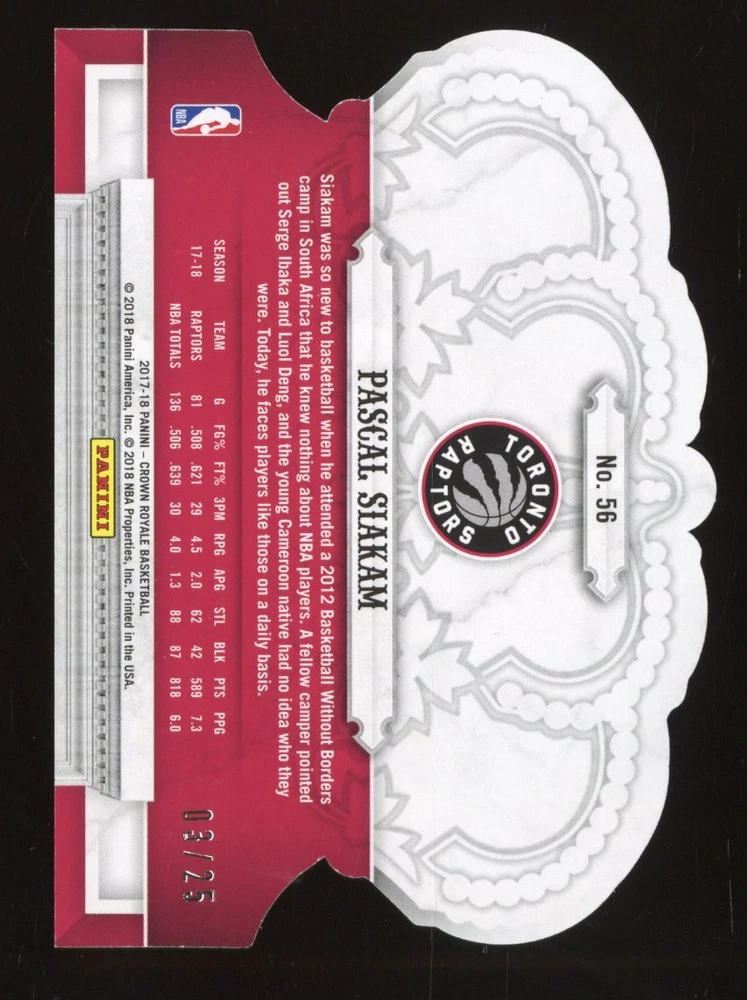 You are purchasing a 2017-18 Panini Crown Royale Pascal Siakam #56 /25. You will receive the exact item in the photographs. Thank you for looking. Listed With Mascot .