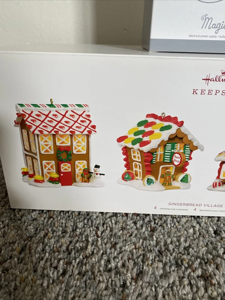 2018 Hallmark Gingerbread Village. Set of 4 gingerbread houses. New in box in original packing, never displayed. Magic cord included. Connect ornaments to magic cord to see a continuous light effect. In excellent condition. Payment due in 3 days. No international shipping.