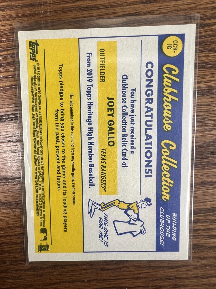 Clubhouse Collection Relics High Number Joey Gallo #CCR-JG 2019 Topps Heritage Shipping will be $4.00 for the first card within the United States, and free for every card after that. I do ship worldwide at a cost of $15.00, every additional card is free. Thanks for checking out my listing, and be sure to look at my other cards currently up for sale!