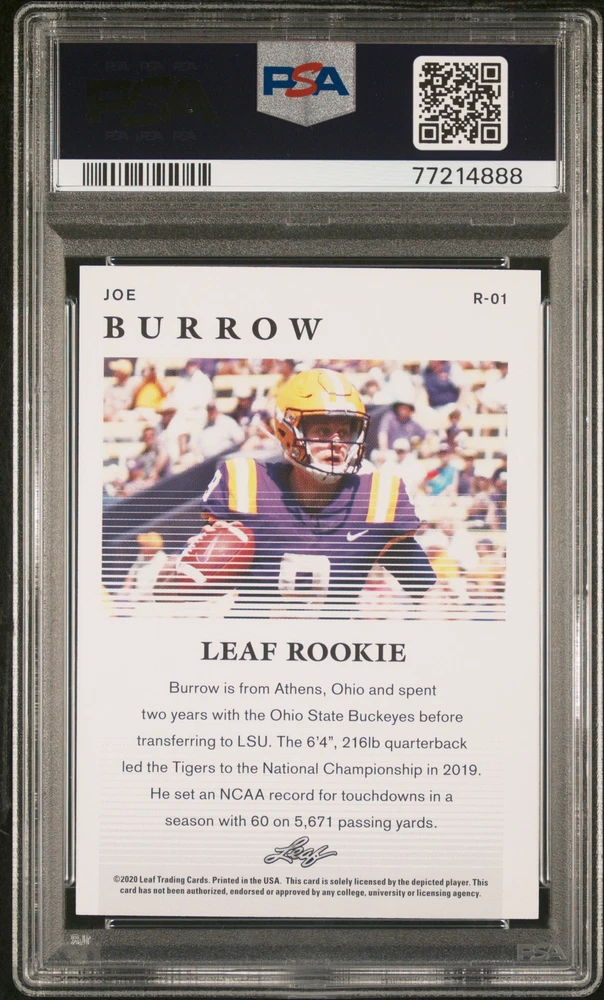 You are purchasing a 2020 Leaf Special Release Rookie Joe Burrow #R-01 Special Release Rookie PSA 9. You will receive the exact item in the photographs. Thank you for looking. Listed With Mascot .