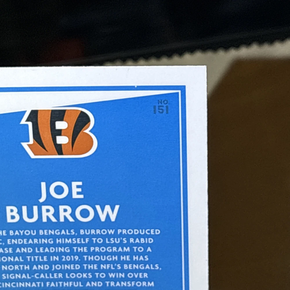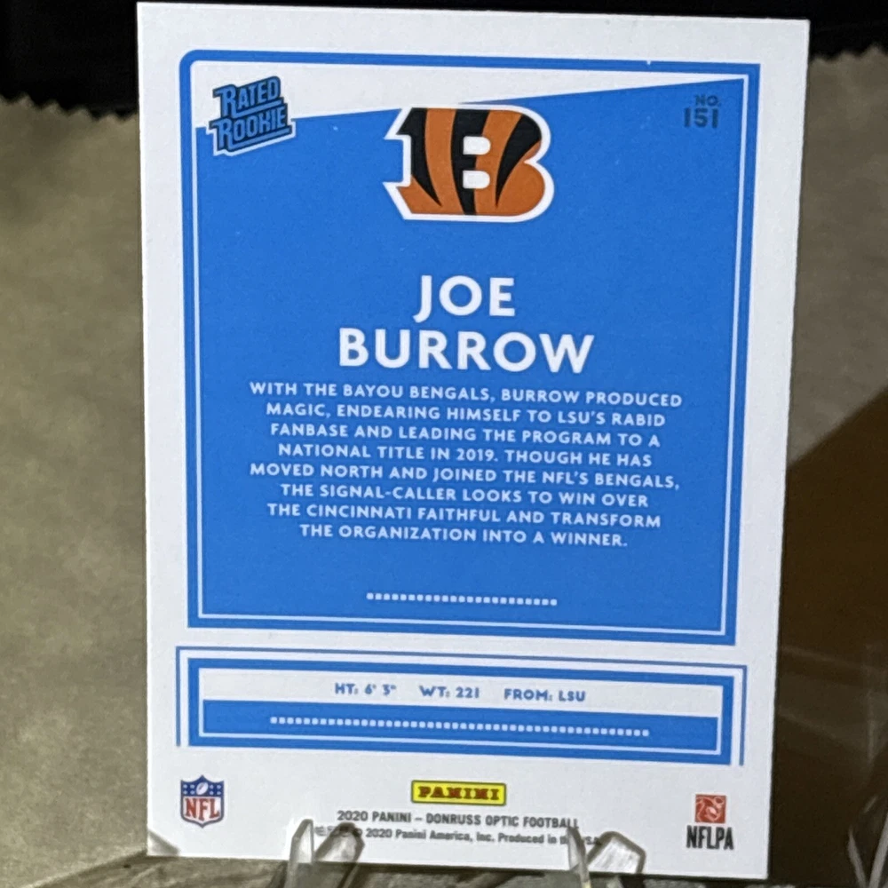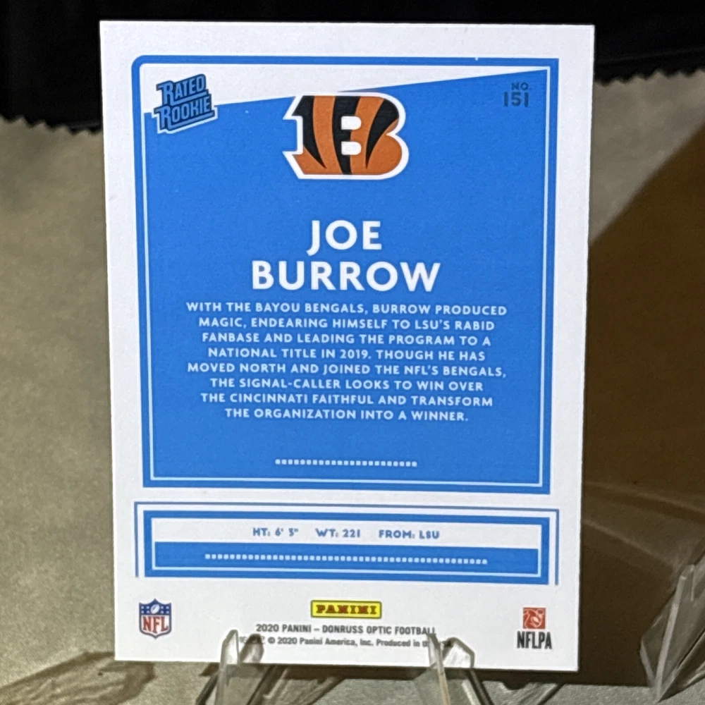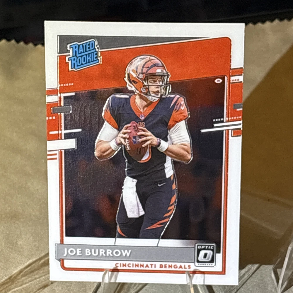 I’m not a grader, so my opinion is pretty clean, a mint +! I am human and only use light and angles, so I always have satisfaction guaranteed for my buyers! Want you to be satisfied with your purchase and service! I’m not perfect and am accountable if I miss something! Thank you so much for your support!🙏 The product is a 2020 Panini Donruss Optic-Rated Rookies Optic #151 Joe Burrow (RC) trading card. It is described as "Pretty Clean" and is in near mint or better condition.