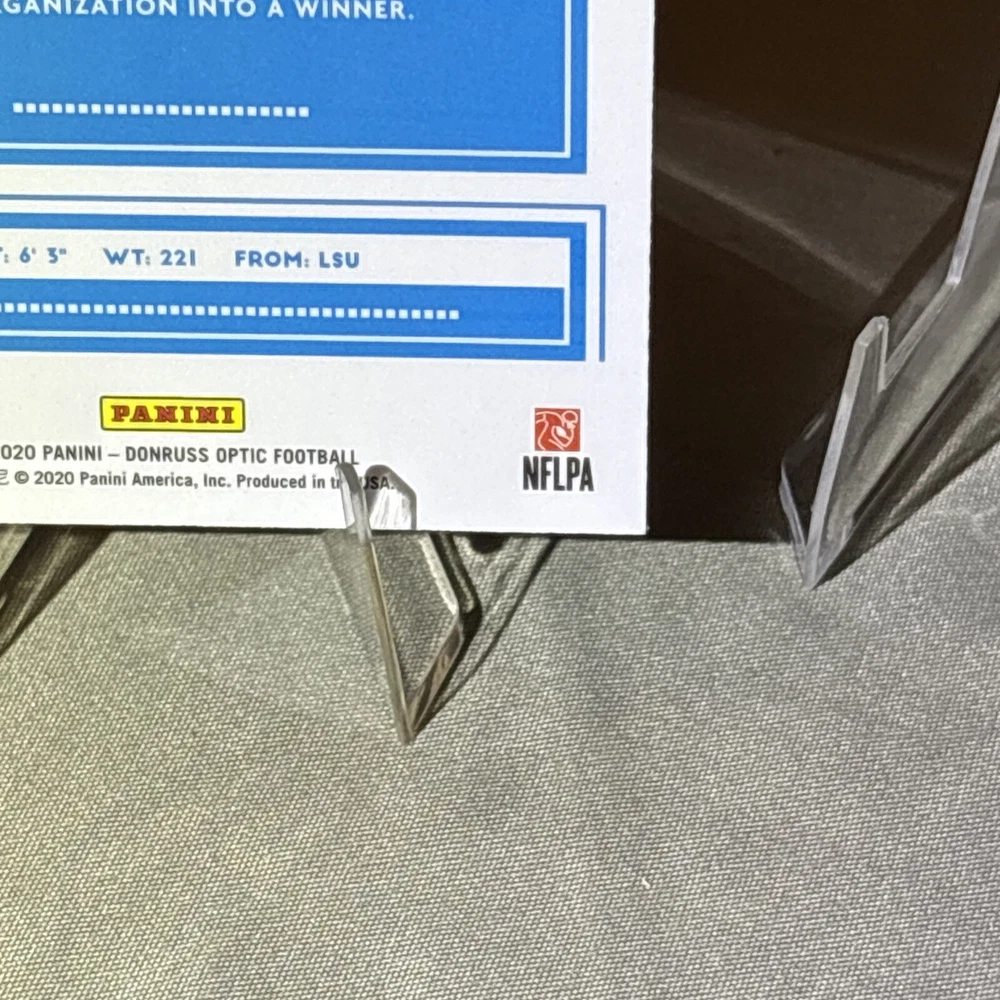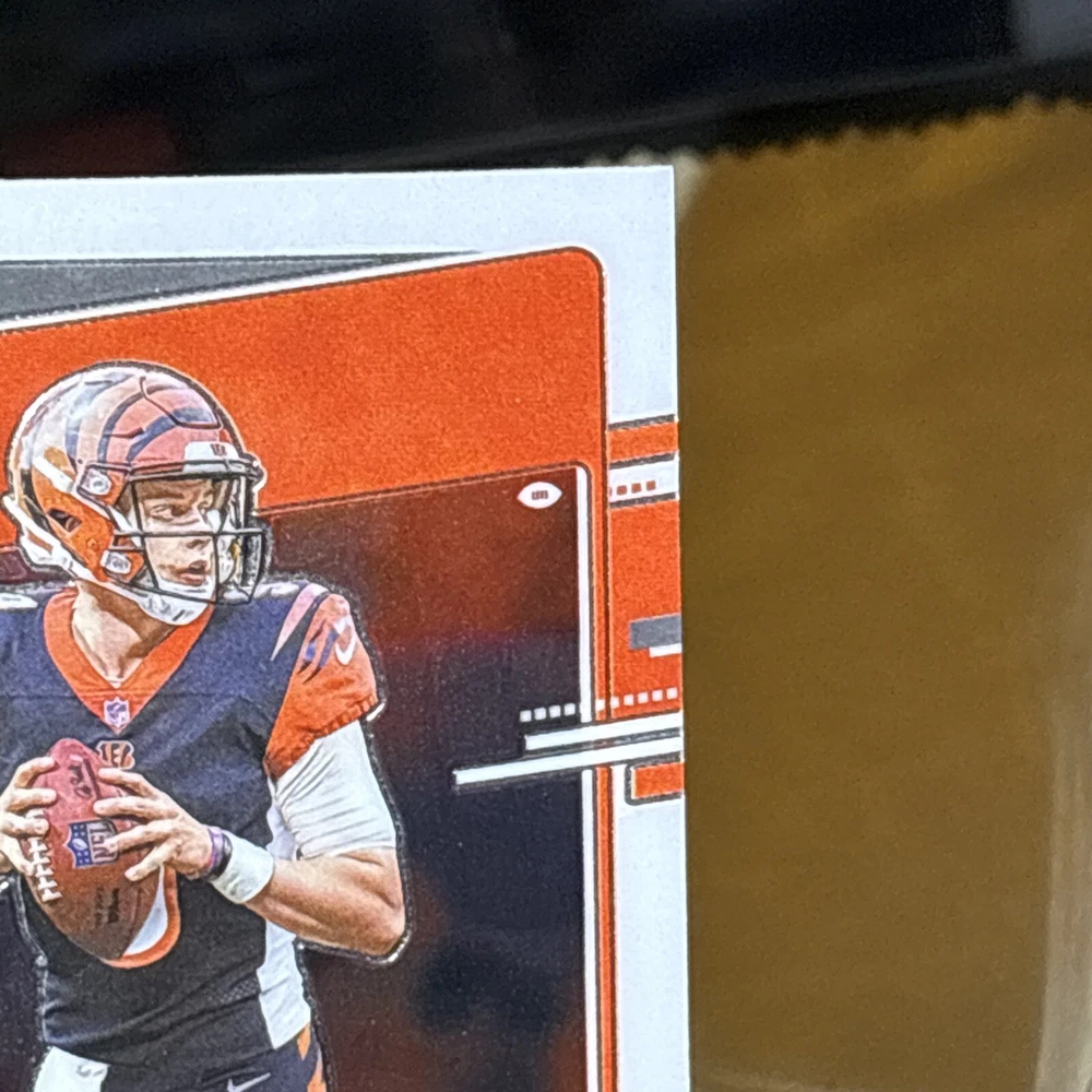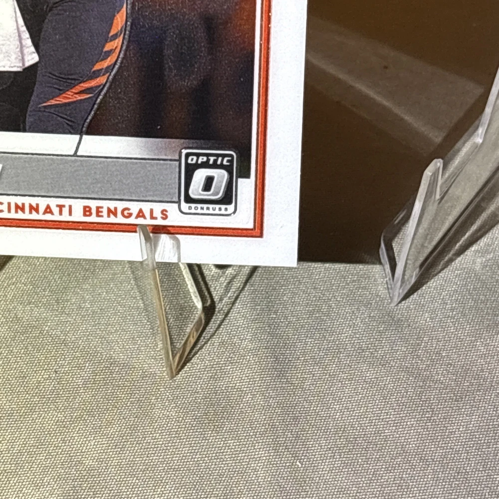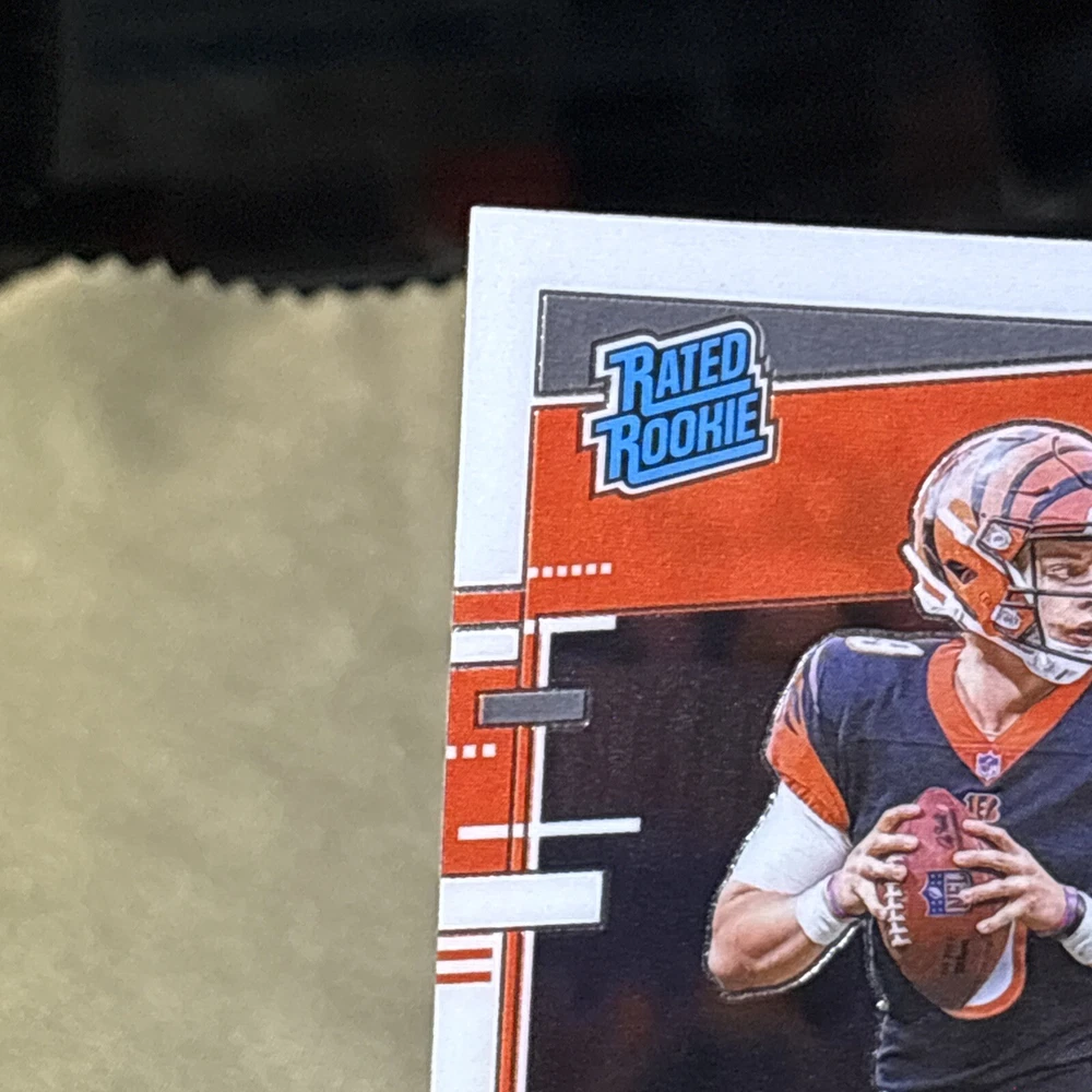 I’m not a grader, so my opinion is pretty clean, a mint +! I am human and only use light and angles, so I always have satisfaction guaranteed for my buyers! Want you to be satisfied with your purchase and service! I’m not perfect and am accountable if I miss something! Thank you so much for your support!🙏 The product is a 2020 Panini Donruss Optic-Rated Rookies Optic #151 Joe Burrow (RC) trading card. It is described as "Pretty Clean" and is in near mint or better condition.