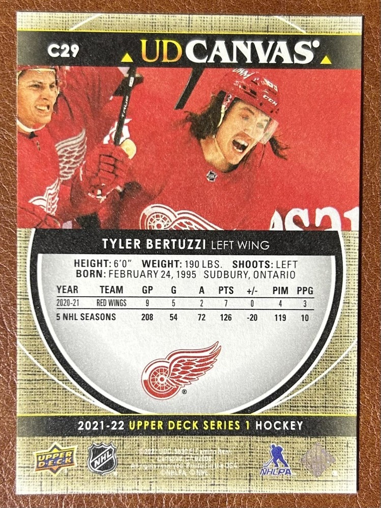 Get your hands on the 2020-21 Upper Deck Series 1 Tyler Bertuzzi UD Canvas #C29 card featuring the Detroit Red Wings player. This sports trading card is a must-have for ice hockey fans who collect memorabilia. Manufactured by Upper Deck and part of the NHL league, this card is an insert in the set and is not autographed. The card number is C29 and it belongs to the 2020-21 season. Add this gem to your collection today.