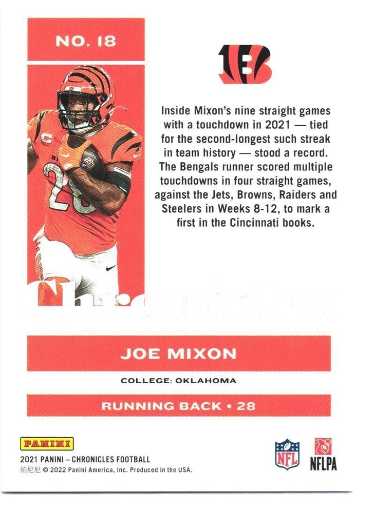 Manufacturer: Panini Set: 2021 Panini Chronicles League: National Football League (NFL) Features: Parallel/Variety Team: Cincinnati Bengals Sport: Football Card Number: 18 Type: Sports Trading Card Player/Athlete: Joe Mixon Season: 2021
