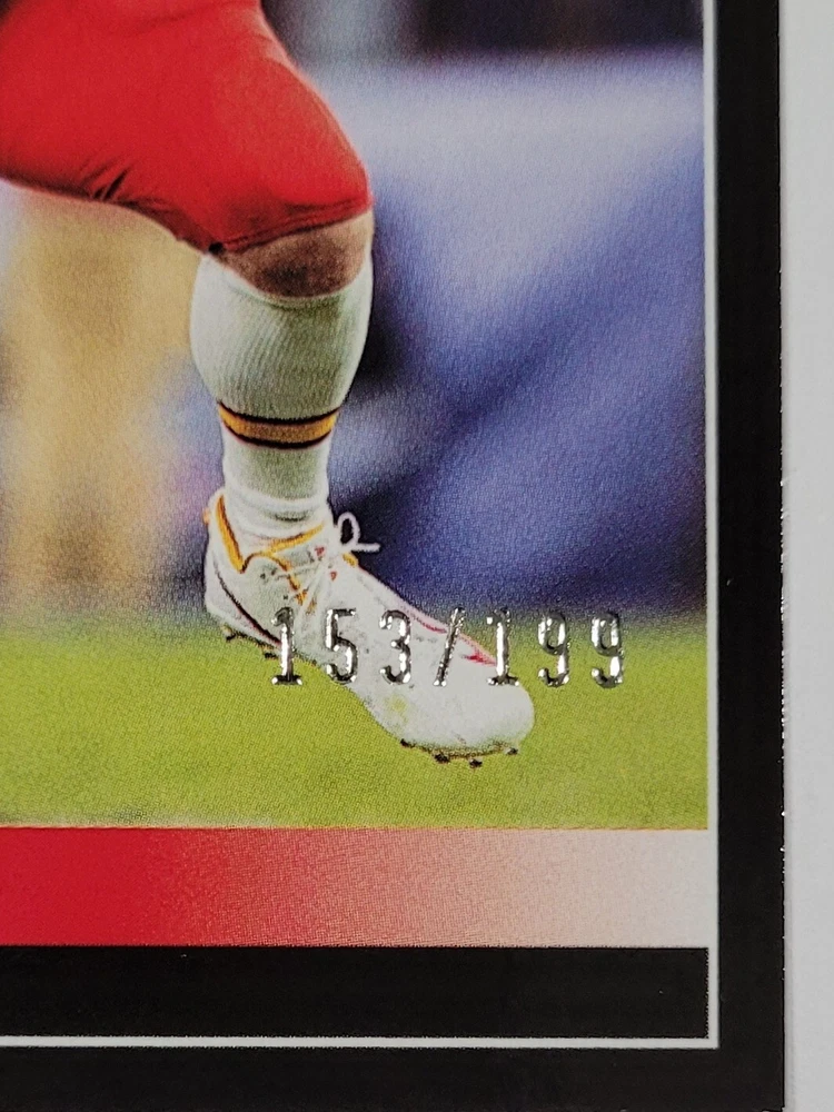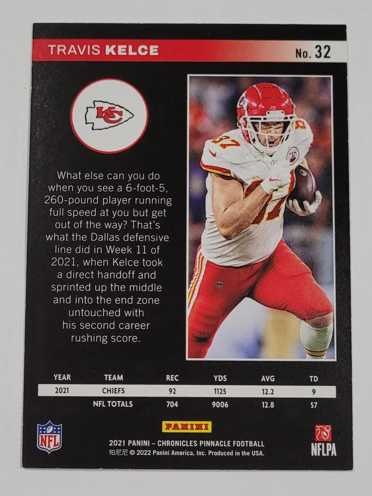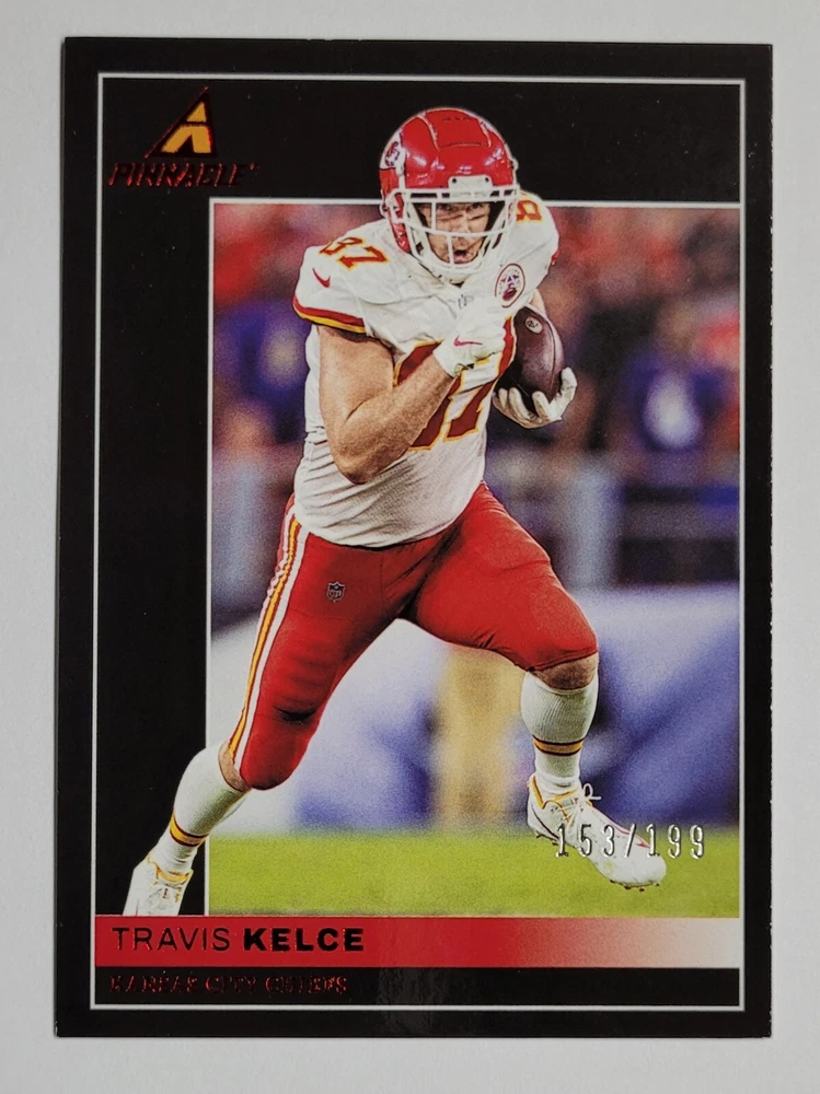 This Travis Kelce trading card is a must-have for any football fan. Featuring a stunning red parallel design, this 2021 Panini Chronicles Pinnacle card is an original and licensed reprint of the Kansas City Chiefs tight end's name. The card is made of high-quality card stock material and is serial numbered 147/199, making it a rare find. In addition to the unique design and rarity of this card, it also includes several desirable attributes such as being a single-insert, original print, and is part of the insert set called "Red Parallel." This card is perfect for collectors and fans alike who want to add a valuable and sought-after item to their collection.