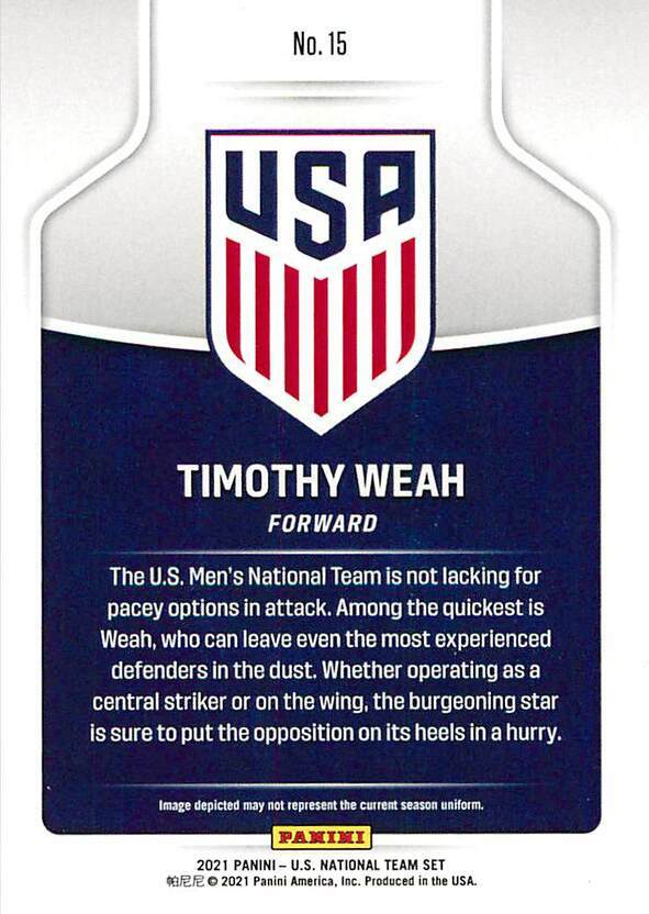Welcome to my store listings. Listings all have the team name in the Description of the listing. For help with web or mobile app searches see my Search Tips page. Timothy Weah 15 2021 Panini (Instant) U.S. National Team USMNT Description: See listing title and scan. NOTE: Full team sets, Men's and Women's combined, still available on the Panini Instant site. ($30 for 30 cards) Team Name: USMNT Condition: NrMt/Mt+ or better. Pack to sleeve. Related Store Items: Searching within the nearby major store categories by name, team, or card brand is the easiest way to find related items. SHIPPING I try and ship every day, but when sales are slow I miss a day. My central US location still provides a very fast shipping time to most of the country. For my most current shipping procedures and discounts visit my Shipping Procedures page. CONDITION/GRADING I grade cards using the Beckett Grading standards. Most people expect cards to come out of packs Mint and that is not the case. Cardboard cards often come out Near Mint, or Near Mint to Mint (NrMt/Mt). Finest and Chrome cards are usually Mint. Many new limited edition inserts and autographs are frequently not Mint. For singles from case listings I will use the lowest grade (NrMt/Mt+ or better) as my default. "Pack To Sleeve" means the condition is what you can expect from a pack. For higher value cards I will include specifics as part of the condition (white spot on corner, minor machine line on surface, rough edge). The scale I use is: NrMt/Mt, NrMt/Mt+, and Mint (Beckett 8.0, 8.5, 9.0. )