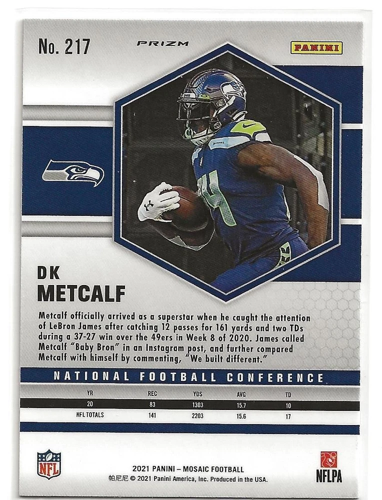 2021 Panini Mosaic DK Metcalf Blue Reactive Parallel Prizm Card Card Description: Year: 2021 Set: Panini Mosaic Insert: Blue Reactive Parallel Card No.: 217 Player: DK Metcalf **Free Shipping** This card will be shipped using the eBay Standard Envelope for Trading Cards service. With this service the card will be protected with a soft sleeve & top loader, placed within a team bag, and sealed into a standard letter size envelope. Tracking will be provided. If you would like this card to be shipped USPS Ground Advantage in a bubble mailer with tracking that is available by request for an additional $3.95. Thank you for looking and be sure to Check out our other Listings!