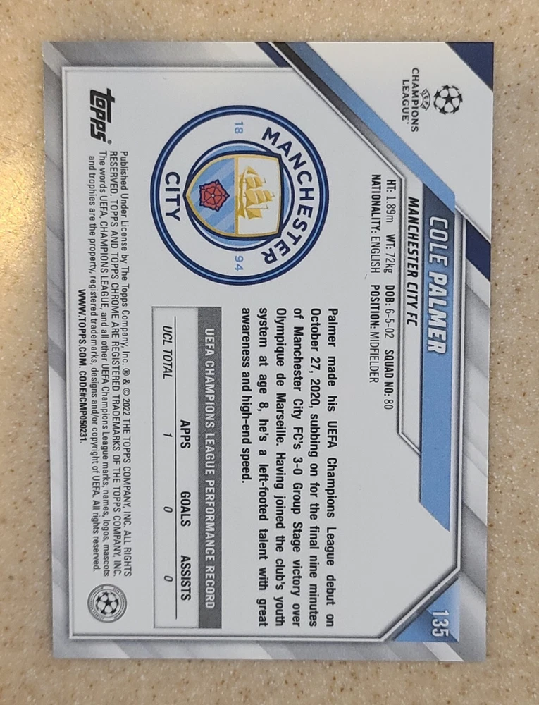 This 2021-22 Topps Chrome UEFA Cole Palmer RC #135 CHROME ROOKIE CARD is a must-have for any soccer fan. Featuring a stylish chrome design, this trading card showcases the up-and-coming Chelsea player in all his glory. As a rookie card, it's a valuable addition to any sports card collection. With its sleek and modern design, this card is perfect for fans of soccer and sports trading cards alike. Whether you're a fan of Cole Palmer or just looking to add to your collection, this card is sure to impress. Don't miss your chance to own this rare and sought-after chrome rookie card.