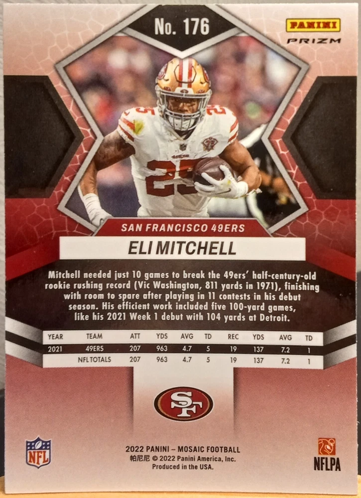 High End Hobby Card Auctions Starting @ $1.99 w/ combined shipping for multiple items purchased. So, the more cards you win, the less you pay per card. Featuring NFL options of 2022 Mosaic Sparkles, 2023 Prizm Football Checkerboard Prizms, 2023 Phoenix Football, & More. Rookies & Veterans. All cards Limited, Short Print, Super Short Print, or Have a Serial Number. So, check out my Seller's Other Items, and get into my store before you miss out on the cards you're looking for. Don't forget to hit the heart sign next to my seller name to follow my page, and get updates on all of my upcoming auctions. Currently have about 20,000 cards to get caught up on posting. So, I'm starting a free high end hobby card giveaway, since the last one went so well. Every 5th card sold, and paid for will come with a free high end hobby card that I match to the team, or sport you purchased. This now goes until December 31st. The giveaway went so well we gave over 50 cards SP, or #'d away to our loyal customers. All cards posted on my account are included in the giveaway. Stay tuned, and appreciate everyone who took part in my last giveaway. Thanks for your time, and rest assured all cards are shipped in water resistant bubble mailers, and w/ a Top Loader, Hard Case, and Dust Cover. No tape anywhere to damage your card during shipping, and a tracking number attached to every card so you know you are getting what you paid for. This 2022 Panini Mosaic Football card features Eli Mitchell of the San Francisco 49ers. The card is a Blue Sparkle Prizm Limited Edition with a card number of 176. It is a Short Print, Hologram, Parallel/Variety, Exclusive, Collectors Edition, Checklist, Exchange/Redemption, Insert, 1st Edition, and Chase. The card is made of 35 Pt. Card Stock and is an Original, not a Licensed Reprint. It is a National Football League (NFL) card with English language and was manufactured in the United States by Panini. The card comes with a set of features that make it a great addition to any football trading card collection.