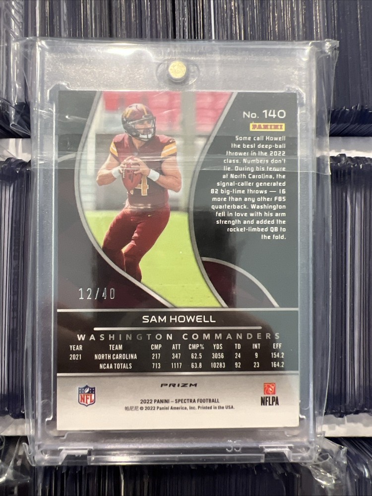 Sport:FootballFeatures:Rookie, Serial Numbered, Base Set, Parallel/VarietyPlayer/Athlete:Sam HowellPrint Run:40Season:2022Subset:RookiesParallel/Variety:Astral PrizmLeague:National Football League (NFL)Card Number:140Additional Description:Rookies - Sam HowellTeam:Washington CommandersSet:2022 Panini Spectrabrand:PaniniManufacturer:PaniniSeries:Panini Spectra