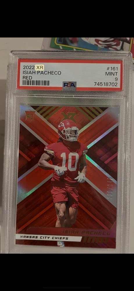 This limited edition Isiah Pacheco trading card is a must-have for any football fan. With a print run of only 085/249, this card is a rare find for collectors. The card features a hologram, laser red parallel/variety, and is serial numbered for added authenticity. As a rookie card, this piece is highly sought after and is part of the exclusive Panini XR set. The card showcases Pacheco in his Kansas City Chiefs and Rutgers Scarlet Knights uniforms and is perfect for fans of either team. Don't miss out on the chance to add this collectors edition card to your collection.