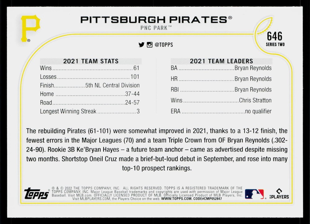 You will receive a , Pittsburgh Pirates 2022 Topps #646 Pittsburgh Pirates Near Mint or Better condition. Please note i am not a professional card grader the condition of raw cards can be very subjective. Please refer to the high quality pictures to determine condition yourself any questions at all please feel free to ask!! we take pride in the quality of cards we sell and ship, all cards will be shipped in a penny sleeve and top loader for added protection. be sure to save us as a seller, as we are growing and listing daily THANK YOU FOR YOUR BUSINESS