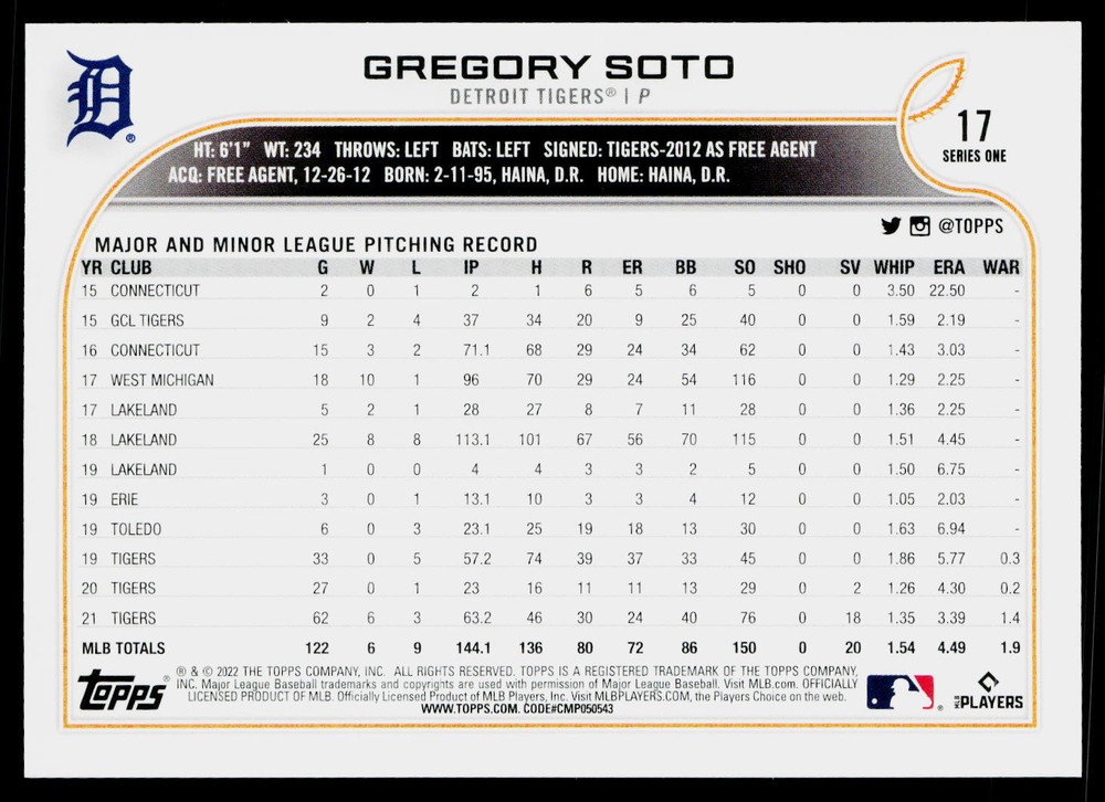 You will receive a , Gregory Soto 2022 Topps #17 Detroit Tigers Near Mint or Better condition. Please note i am not a professional card grader the condition of raw cards can be very subjective. Please refer to the high quality pictures to determine condition yourself any questions at all please feel free to ask!! we take pride in the quality of cards we sell and ship, all cards will be shipped in a penny sleeve and top loader for added protection. be sure to save us as a seller, as we are growing and listing daily THANK YOU FOR YOUR BUSINESS