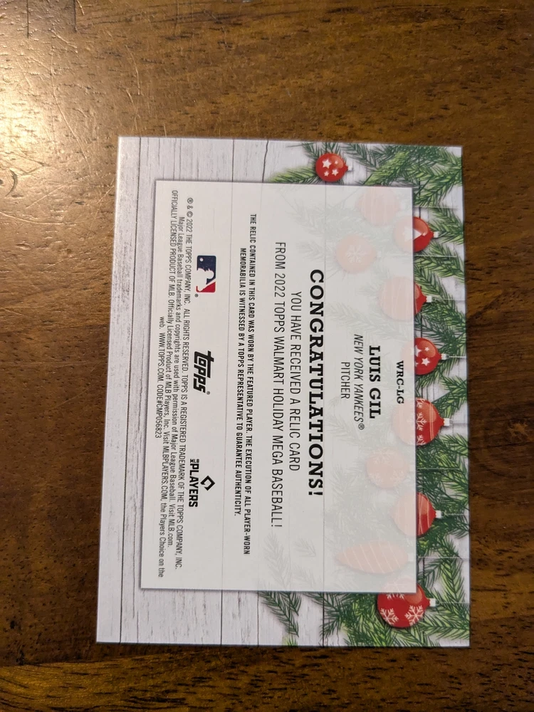 Relics Luis Gil #WRC-LG 2022 Topps Holiday Shipping will be $4.00 for the first card within the United States, and free for every card after that. I do ship worldwide at a cost of $15.00, every additional card is free. Thanks for checking out my listing, and be sure to look at my other cards currently up for sale!
