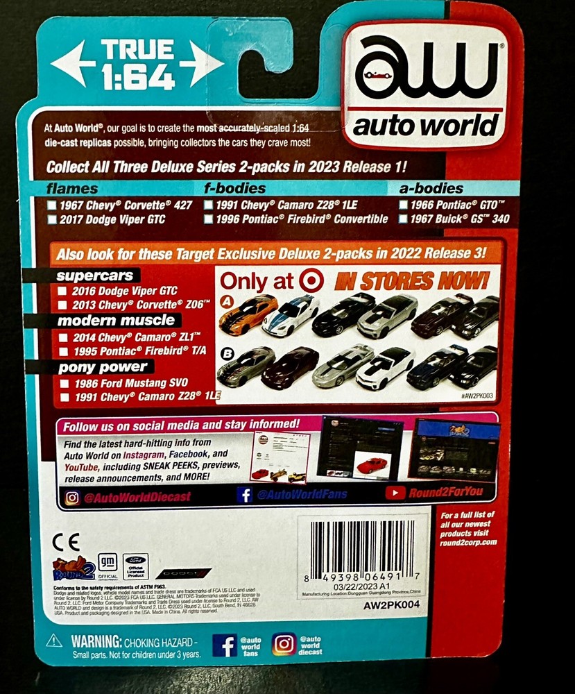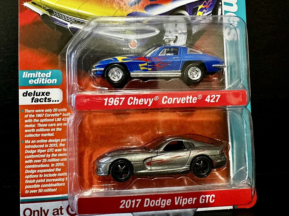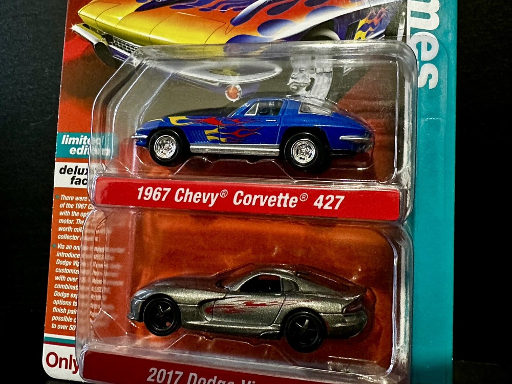 This 2 pack set from Auto World's Auto Drivers series features two iconic cars from the Corvette family. The 1967 Chevy Corvette 427 and 2017 Dodge Viper GTC are both beautifully crafted in 1:64 scale with multi-color paint jobs. These limited edition diecast cars come in an unopened box and are perfect for collectors or fans of the Corvette family. The set is recommended for ages 14 and up and was manufactured in China.