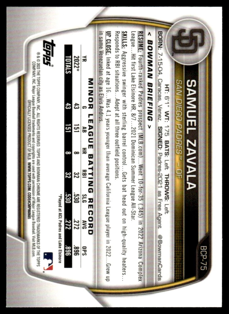 About Me Other Listings Feedback Add to Favorites Contact Me Cobos Cards and Collectibles 2023 Bowman Chrome Prospects Sapphire Samuel Zavala San Diego Padres #BCP-75 No stock photo / These are real scans or pictures Details Description: Samuel Zavala Category: Baseball Year: 2023 Product: Bowman Chrome Prospects Sapphire Team: San Diego Padres Card Number: BCP-75 Dimensions: 3½" x 2½" SKU: BL B0050 R02 C (24) Payment Card Condition is Raw, and can vary. These cards may or may not be for grading purposes do to flaws. Please look at the pictures for true condition. Shipping Cobos Cards Combined Shipping PolicyAt Cobos Cards, we strive to make your shopping experience as smooth as possible. Here's how our combined shipping works:Discounted Combined Shipping: Enjoy combined shipping at just $4 Dollar Base with $0.50 for each additional item purchased within 7 days of one another.Automatic Convenience: Shipping costs are automatically combined at checkout—no need to request a combined invoice!Maximum Shipping Cap: No matter how many items you order, shipping costs will never exceed $20.00 for eligible items in a single order.Payment Requirements: To qualify for combined shipping discounts, all items must be paid for in a single transaction.eBay Checkout Limit: Please note that eBay currently limits checkout to a maximum of 40 items per transaction.Thank you for choosing Cobos Cards for your collecting needs! If you have any questions, feel free to reach out.Additionally ( We use an AI system to list thousands of cards at a time therefore every once in a while the listing title might not be accurate. The picture of the card will always be the card you will receive) Listing By Kronocard trading cards software v2.8.2.3