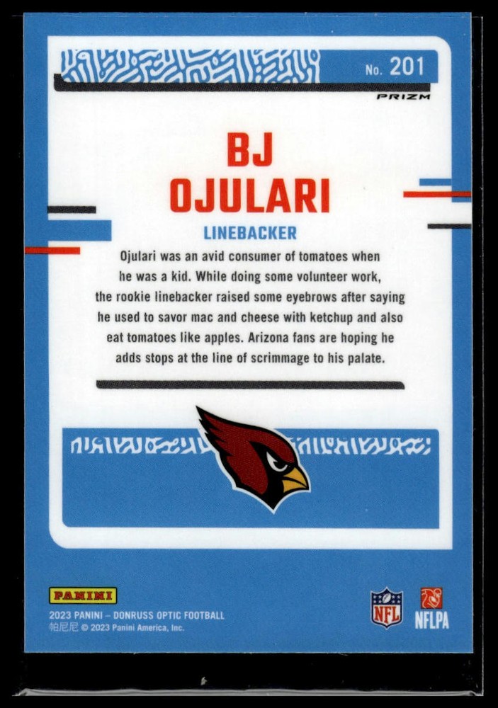 This is a nice example of a 2023 Donruss Optic #201 BJ Ojularir Rated Rookie Purple Shock Other important information about this card: RC,Chase,CHecklist,Parallel,Holo,SP,Insert In 2023 BJ Ojularir Rated Rookie played for the Arizona Cardinals. Please check out our other listings for more great cards.