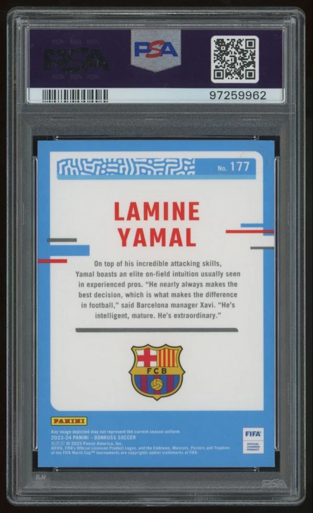 2023 Donruss Optic Lamine Yamal PSA 10 FC Barcelona #177 No stock photo / These are real scans or pictures Description Description: 2023 Donruss Optic Lamine Yamal PSA 10 FC Barcelona #177 Category: Soccer Year: 2023 Product: Donruss Optic Team: FC Barcelona Card NO:177 Dimensions: 5¼" x 3" Payment Paypal GPay Visa MasterCard AMEX Discover Shipping NEW: We now offer shipping from Germany! Expect packages within 2-5 days! Prices are negotiable. All sales are final. NEU: Wir bieten jetzt Versand aus Deutschland an! Erwarten Sie Pakete innerhalb von 2-5 Tagen! Preise sind verhandelbar. Alle Verkäufe sind endgültig.Shipping within 1-3 business days of receiving cleared payment. Shipping prices reflect the cost of customs forms on all items.All cards sent via eBay envelope to the U.S. will take up to 10 business days. This is due to being shipped from an APO address. For faster service please pay for the standard shipping. Returns and Claims All sales are final, but we are very flexible regarding any damaged or lost items not caused by the buyer. About Us Sports Card Veteran (SCV) is a veteran owned hobby shop dedicated to providing the highest quality of raw and graded cards at the best prices. Our inventory consists of more than 100,000 sports cards and memorabilia spanning from the 1960s to present day. You will not find better customer service anywhere because we take great pride in helping everyone from the novice collector to the expert in achieving their collection goals. Additionally, because we believe in helping to those who served, a percentage of our proceeds goes to charities supporting veterans, to include The Fisher House and Disabled American Veterans. Listing By Kronocard trading cards software v2.8.1.1