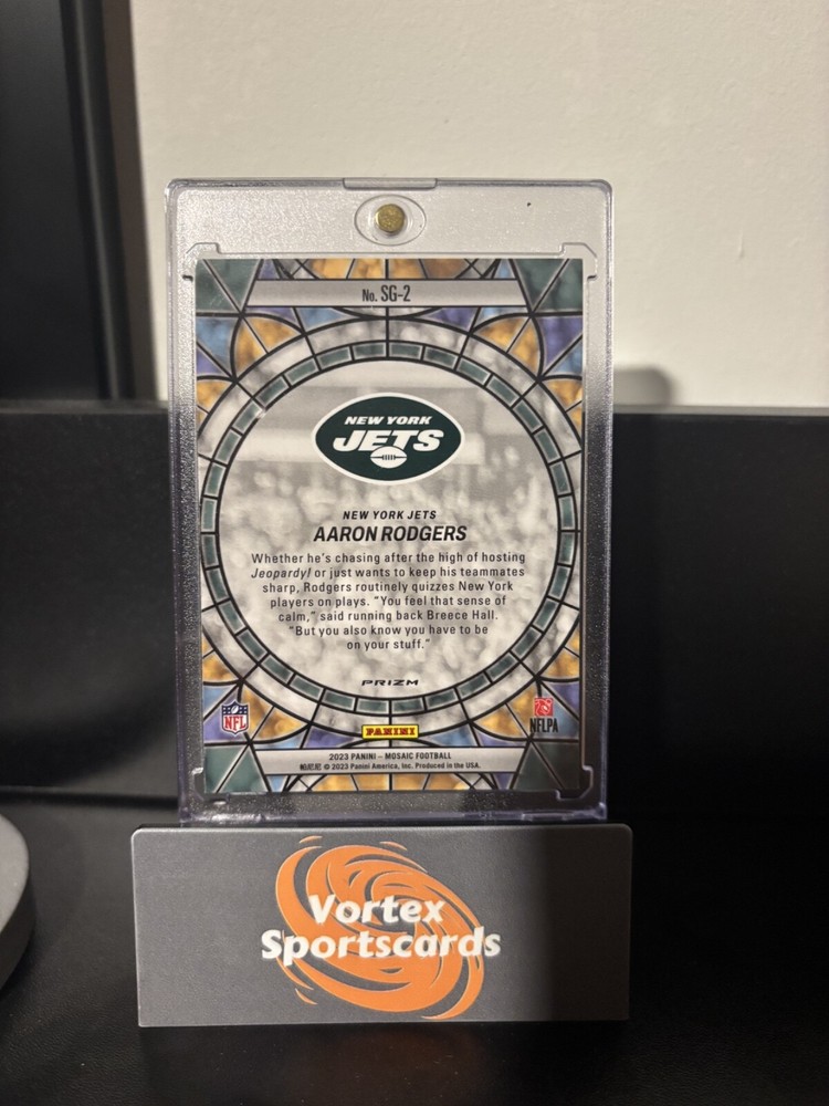 The 2023 Panini Mosaic Aaron Rodgers Stained Glass SSP Glass Mosaic trading card features the NFL quarterback in a unique stained glass design. This sports trading card is a part of the 2023 Panini Mosaic set and showcases Rodgers in his Green Bay Packers and New York Jets uniforms. As an unautographed card, it holds value for collectors interested in rare variations like the stained glass parallel. Perfect for fans of Aaron Rodgers and football trading cards, this limited edition card is a must-have for any collector's collection.