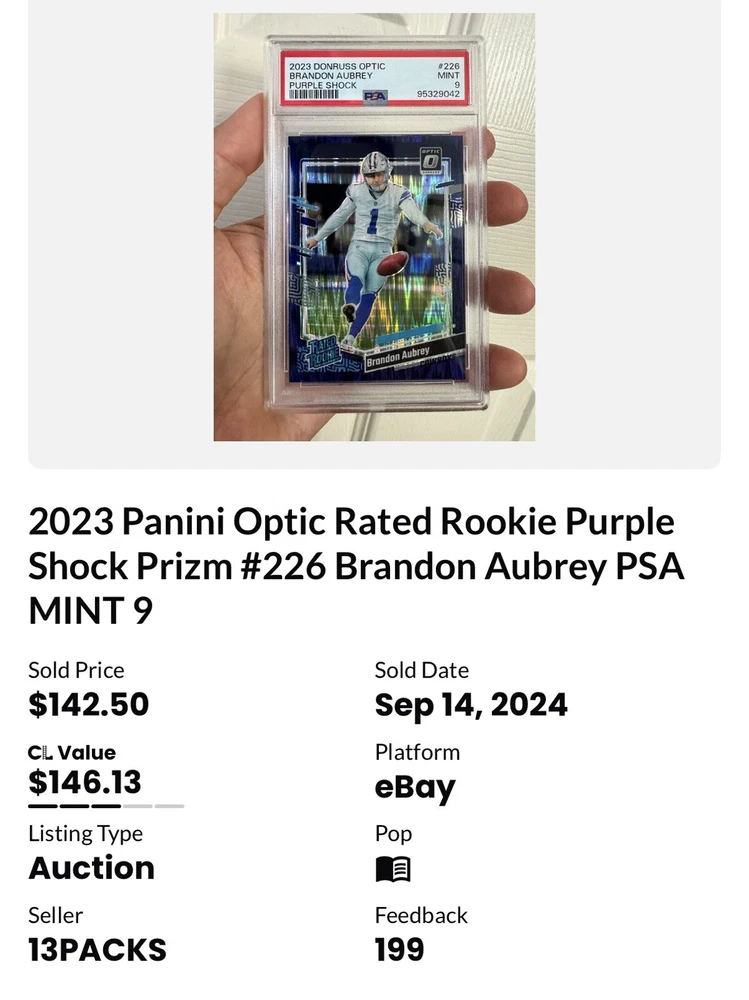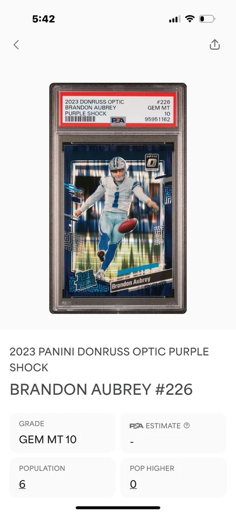 This 2023 Panini Donruss Optic Rated Rookie Purple Shock Prizm #226 Brandon Aubrey PSA 10 is a must-have for any football fan. With its stunning design and high-quality printing, this sports trading card is a true collector's item. Featuring a parallel/variety of purple shock prizm, this card is sure to stand out in any collection. The card is from the National Football League (NFL) and features Brandon Aubrey, a up-and-coming player. It is part of the base set and is a rookie card, making it even more valuable to collectors. This card is perfect for anyone who loves collecting sports trading cards and want to add a high-quality, rare item to their collection.