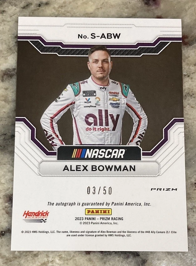 This 2023 Panini Prizm trading card features Alex Bowman, a NASCAR driver for Hendrick Motorsports. The card is an autographed, serial numbered, and limited edition Scripts Checkered Flag Prizm variant, with a print run of only 50. The card is a must-have for fans and collectors of auto racing memorabilia. It comes from the 2023 Panini Prizm set and is signed by the driver himself. The card number is S-ABW and it belongs to the category of Trading Card Singles, Sports Trading Cards, and Sports Mem, Cards & Fan Shop. Get your hands on this rare and valuable card today!