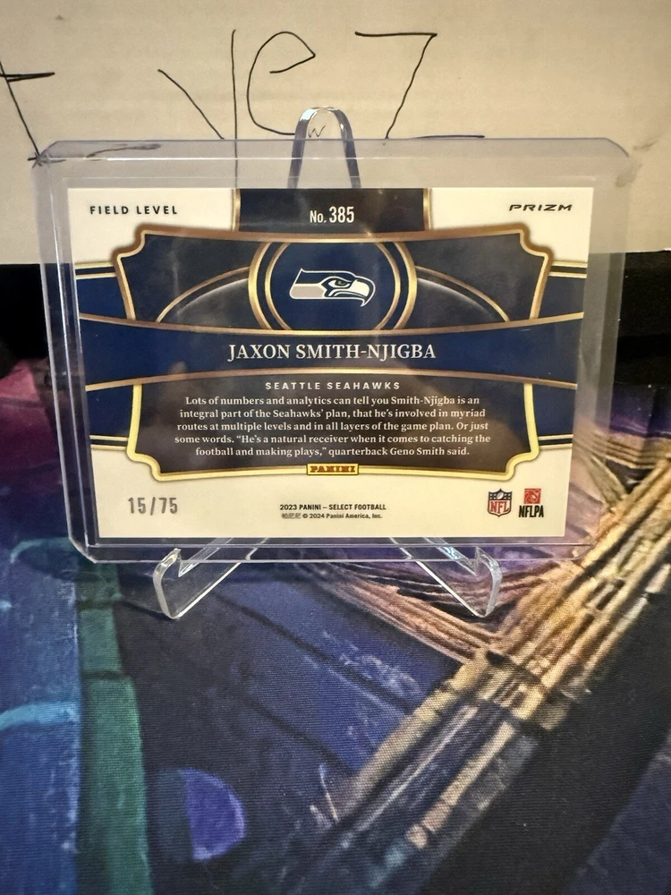 This 2023 Panini Select Field Level trading card features Jaxon Smith-Njigba of the Seattle Seahawks. The card is part of the Tri-color parallel/variety and has a print run of /75. It is a rookie card and is in excellent shape, near mint or better. The card number is 385 and it was manufactured in 2023 by Panini. This card is a must-have for any National Football League (NFL) fan or collector of sports trading cards.