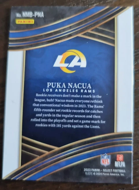 Player/Athlete: Puka Nacua Type: Sports Trading Card Team: Los Angeles Rams Manufacturer: Panini Sport: Football Autographed: No Season: 2023 Set: 2023 Panini Select Franchise: Football Card Size: 4" x 3" Vintage: No League: National Football League (NFL) Game: Unspecified Original/Licensed Reprint: Original Year Manufactured: 2023 Features: Rookie