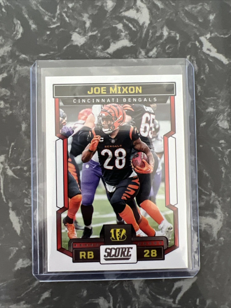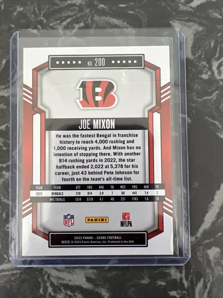 This 2023 Score sports trading card features Joe Mixon of the Cincinnati Bengals in the National Football League (NFL). The card is part of the 2023 Score set and has a card number of 200. It is a near mint or better quality card manufactured by Panini. This item is perfect for collectors of sports trading cards, especially those interested in football and the NFL. It is a great addition to any collection and is sure to impress. Don't miss out on this opportunity to own a piece of sports history.