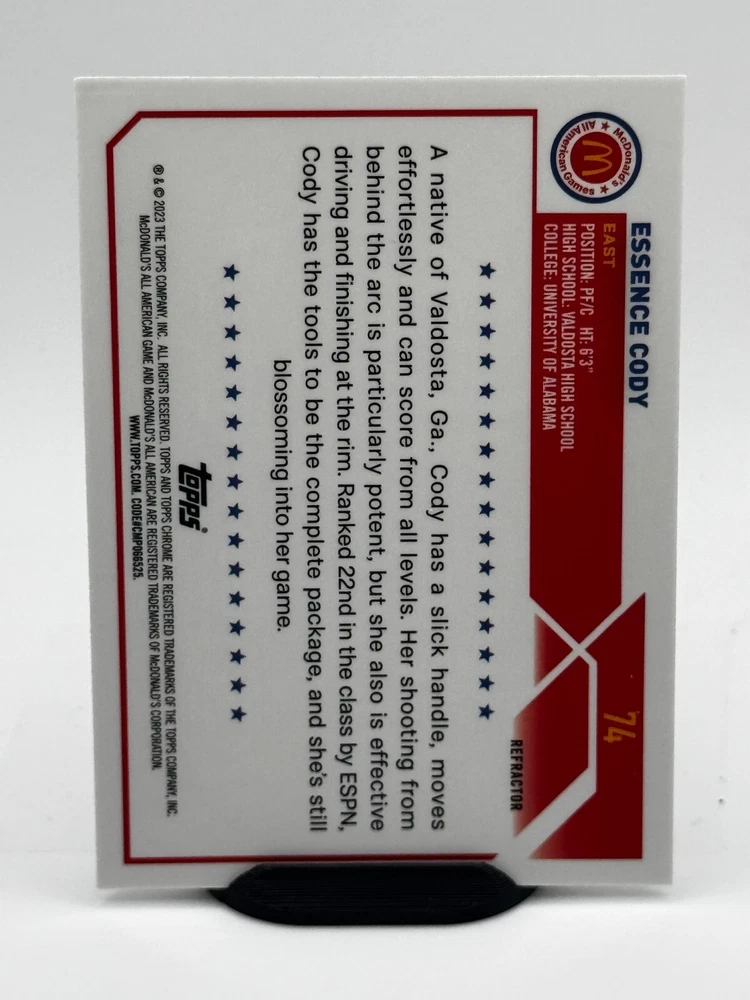 This 2023 Topps Chrome McDonald's All-American Essence Cody Refractor SP #74 trading card is a must-have for any basketball fan. Featuring a short print, parallel/variety, base set, and rookie, this card is sure to be a valuable addition to any collection. The card is made of 35 Pt. card stock and is an original, not a licensed reprint. The card showcases Essence Cody, a player for the Alabama Crimson Tide team in the National Collegiate Athletic Association (NCAA). It is a standard size card and was manufactured by Topps in the United States. The card is in English and is part of the 2023 season. Don't miss out on the chance to add this sports trading card to your collection.