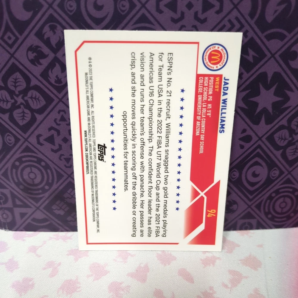 This 2023 Topps McDonalds Basketball card features Jada Williams, player for the Arizona Wildcats in the National Collegiate Athletic Association (NCAA) league. The card is from the 2023 Topps Chrome set and is a base set card with card number 94. The card is near mint or better in condition and is ungraded. It is a sports trading card manufactured by Topps and does not come autographed. This is a great addition to any sports trading card collection and perfect for fans of Jada Williams or the Arizona Wildcats.
