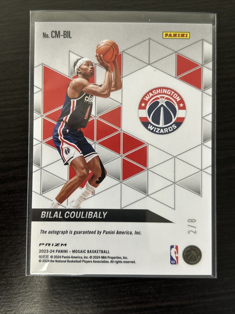 The 2023-24 Panini Mosaic Bilal Coulibaly RC Rookie Collage Auto Black Gold trading card is a rare and highly sought-after collectible in the sports memorabilia market. Featuring an autograph from NBA player Bilal Coulibaly, this card is part of the limited 2023 Panini Mosaic set with a print run of only 8. The card is a parallel choice black gold variety on standard card stock, making it a valuable addition to any basketball card collection. With its unique features like being serial numbered, a short print, and a rookie insert, this card is a must-have for fans of the Washington Wizards and the NBA.